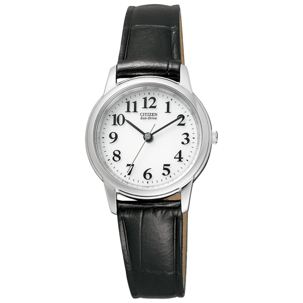 Citizen Collection FRB36-2261 - ladies watch made by Citizen. It is equipped with Japanese solar quartz movement and E031 calibre. Stainless steel case of round shape. Case dimensions are 26 mm. in diameter and 6.6 mm. in thickness. The dial of this Citizen watch is white. Display type: analog. This timepiece has mineral glass. Leather band, band color: black. 50 m. water resistance. The watch is from Citizen Collection collection. The following features are equipped: antimagnetic.