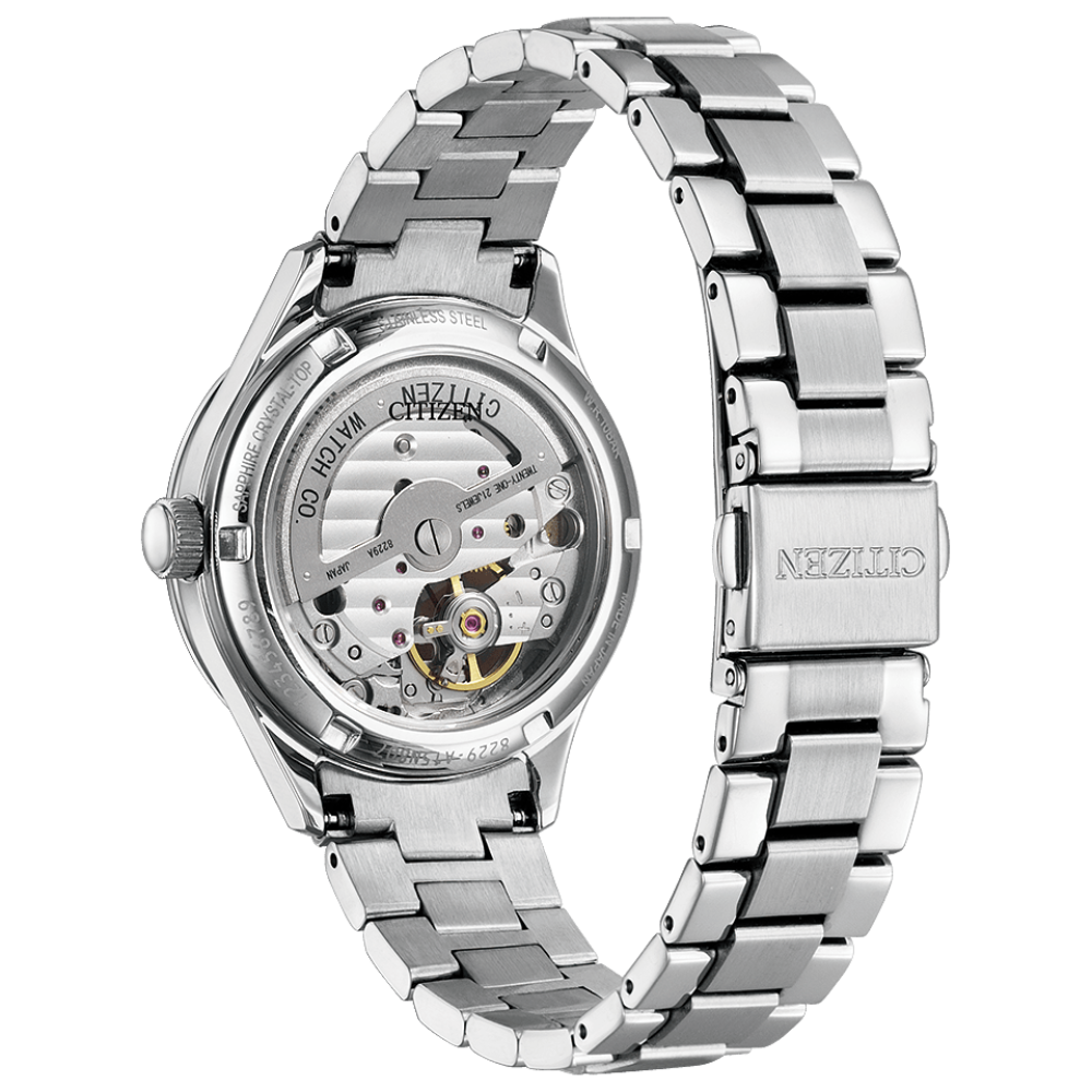Citizen Collection "Kinpekiju" Limited Edition PC1010-52L - ladies watch made by Citizen. It is equipped with Japanese automatic movement and 8229 calibre. Stainless steel case of round shape. Case dimensions are 34 mm. in diameter and 11.1 mm. in thickness. The dial of this Citizen watch is blue. Display type: analog. This timepiece has sapphire glass. Stainless steel band, band color: silver. 100 m. water resistance. The watch is from Citizen Collection collection. The following features are equipped: limited edition.
