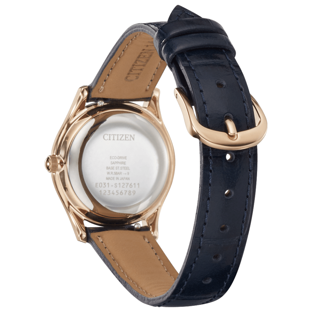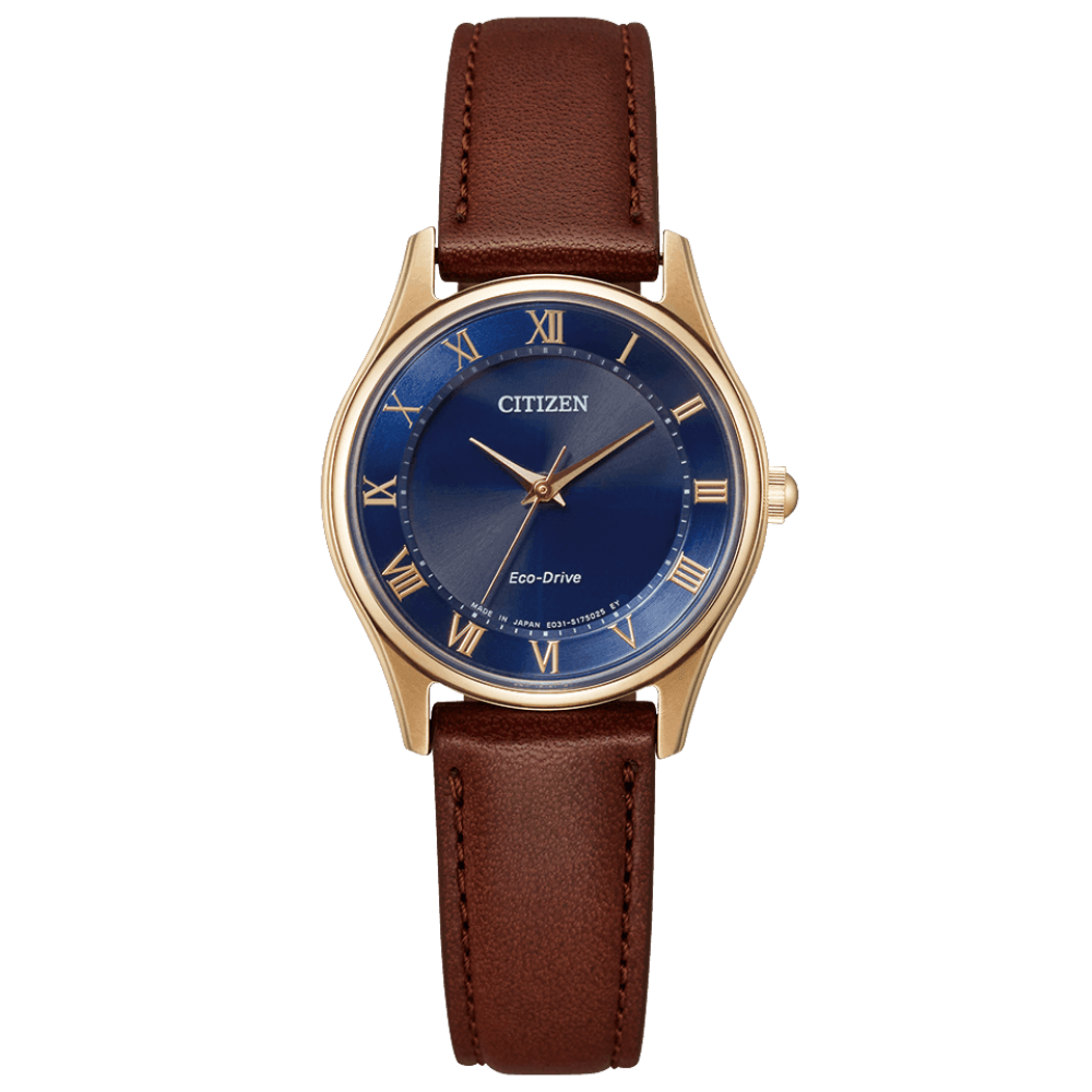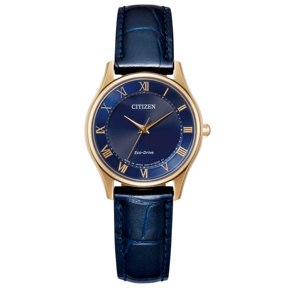 Citizen Collection Limited Model EM0407-01L - ladies watch produced by Citizen. It has Japanese solar quartz movement and E031 calibre. Stainless steel, gold plated case of round shape. Case dimensions are 27.7 mm. in diameter and 7.1 mm. in thickness. The dial of this Citizen watch is blue. Display type: analog. This timepiece has sapphire glass. Leather band, band color: blue, brown. 50 m. water resistance. The watch is from Citizen Collection collection. The following features are equipped: limited edition.