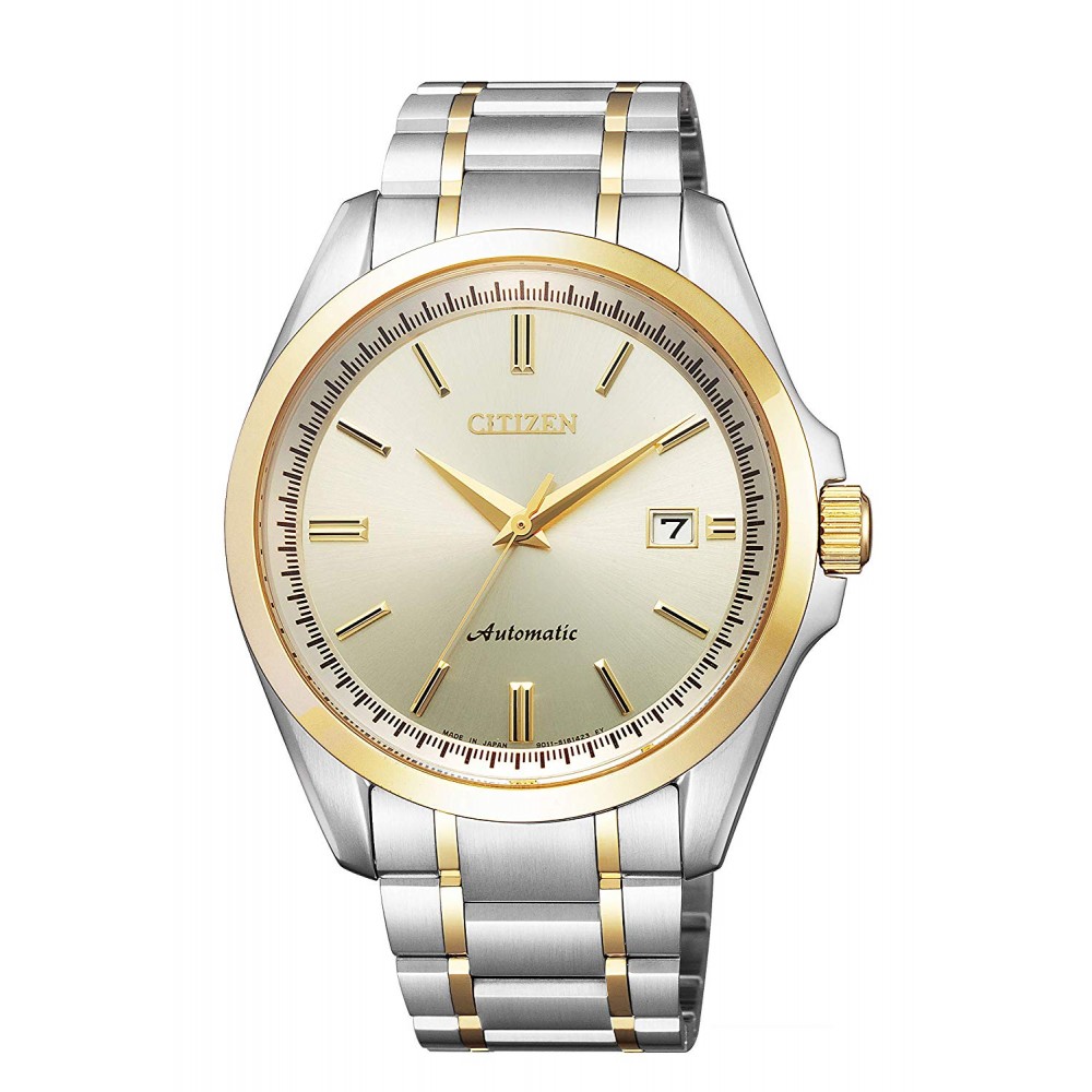 CITIZEN COLLECTION NB1044-86P - men's watch made by Citizen. It has Japanese automatic movement and 9011 calibre. Stainless steel, gold plated case of round shape. Case dimensions are 41 mm. in diameter and 11 mm. in thickness. The dial of this Citizen watch is gold. Display type: analog. This timepiece has sapphire, antireflection coating glass. Stainless steel, gold plated band, band color: silver, gold. 100 m. water resistance. The watch is from Citizen Collection collection. The following features are equipped: date.