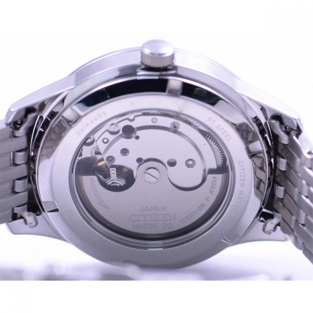 CITIZEN COLLECTION NY4050-54A - men's watch made by Citizen. It is equipped with Japanese automatic movement and 8200 calibre. Stainless steel case of round shape. Case dimensions are 40 mm. in diameter and 10.7 mm. in thickness. The dial of this Citizen watch is white, silver. Display type: analog. This timepiece has sapphire glass. Stainless steel band, band color: silver. 50 m. water resistance. The watch is from Citizen Collection collection. The following features are equipped: date, day.