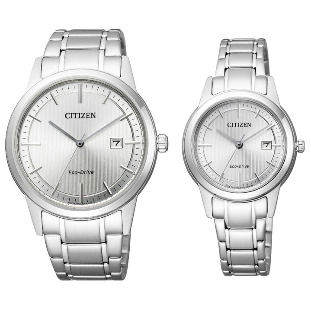 CITIZEN COLLECTION PAIR AW1231-66A/FE1081-67A - men's, ladies watches made by Citizen. They have Japanese solar quartz movements and J810, J710 calibre. Stainless steel cases of round shapes. Cases dimensions are 40, 29.4 mm. in diameter and 9, 8.3 mm. in thickness. The dials of these Citizen watches are silver. Display type: analog. These timepieces have mineral glasses. Stainless steel bands, bands color: silver. 30 m. water resistance. The watches are from Citizen Collection collection. The following features are equipped: date.