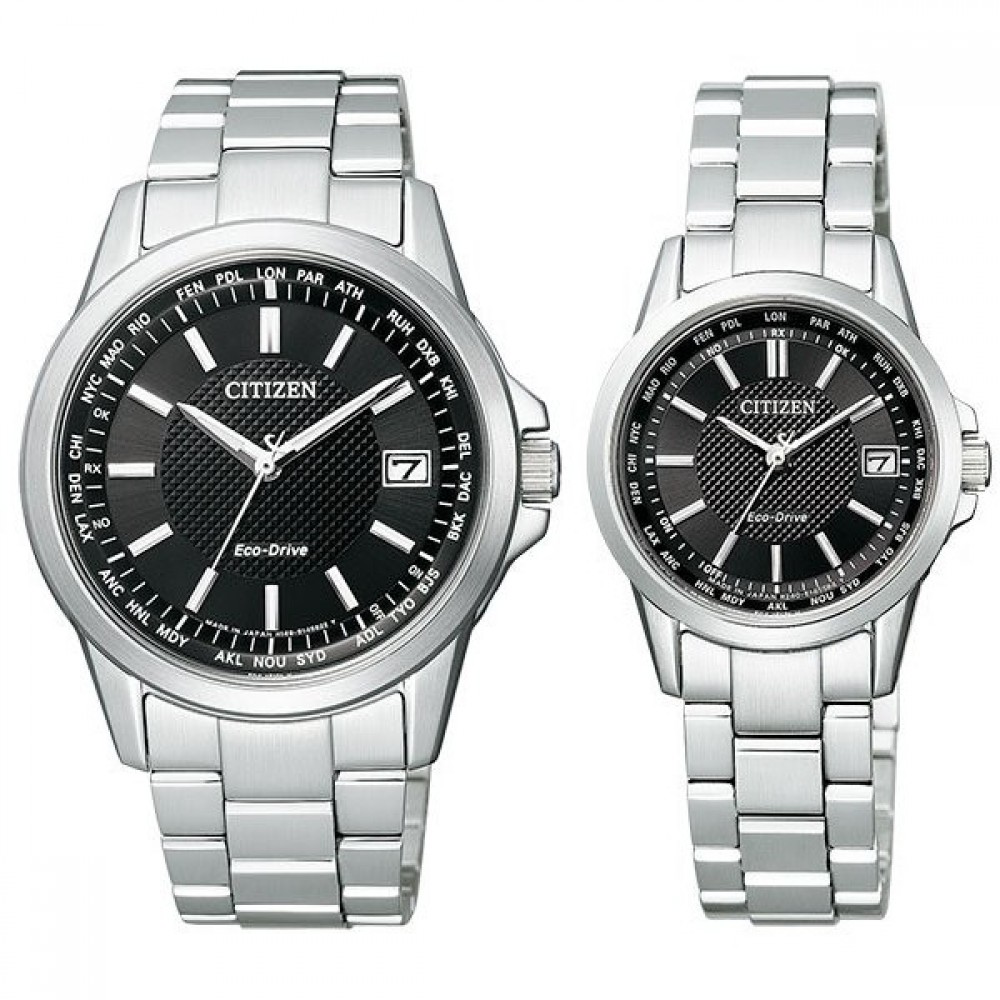 CITIZEN COLLECTION PAIR CB1090-59E/EC1130-55E - ladies, men's watches made by Citizen. They have Japanese solar quartz movements and H149, H240 calibre. Stainless steel cases of round shapes. Cases dimensions are 38.7, 27.6 mm. in diameter and 9.2, 8.1 mm. in thickness. The dials of these Citizen watches are black. Display type: analog. These timepieces have sapphire glasses. Stainless steel bands, bands color: silver. 100 m. water resistance. The watches are from Citizen Collection collection. The following features are equipped: radio controlled, date, antimagnetic, perpetual calendar, world time.