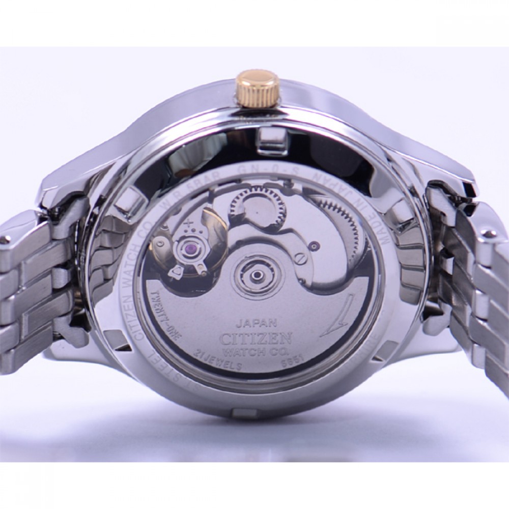 CITIZEN COLLECTION PD7154-53P - ladies watch produced by Citizen. It has Japanese automatic movement and 6651 calibre. Stainless steel, gold plated case of round shape. Case dimensions are 29 mm. in diameter and 10.6 mm. in thickness. The dial of this Citizen watch is silver. Display type: analog. This timepiece has sapphire glass. Stainless steel band, band color: silver. 50 m. water resistance. The watch is from Citizen Collection collection. The following features are equipped: date, day.