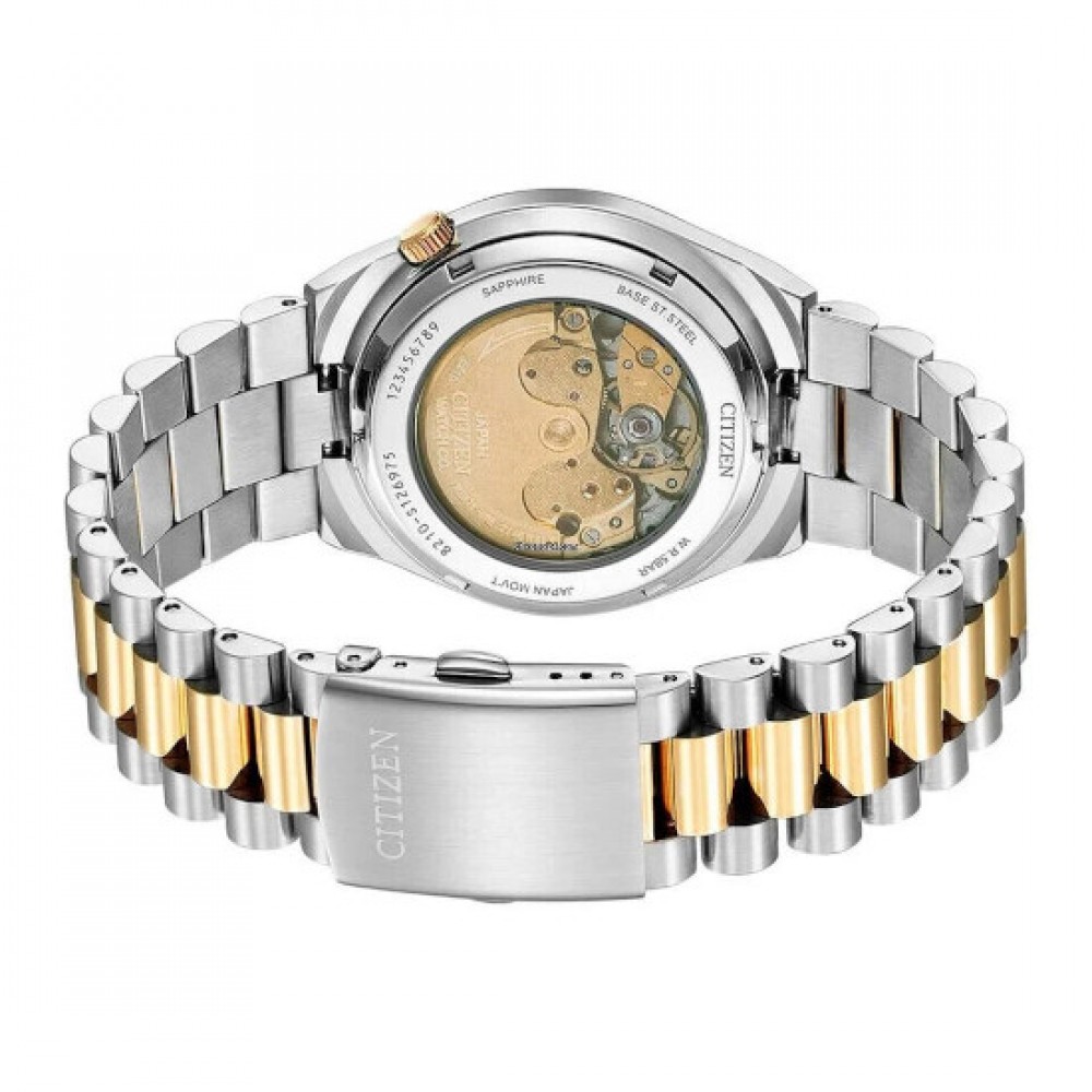 Citizen Collection Tsuyosa Automatic NJ0154-80H - men's watch made by Citizen. It is equipped with Japanese automatic movement and 8210 calibre. Stainless steel, gold plated case of round shape. Case dimensions are 40 mm. in diameter and 12 mm. in thickness. The dial of this Citizen watch is black. Display type: analog. This timepiece has sapphire glass. Stainless steel, gold plated band, band color: silver, gold. 50 m. water resistance. The watch is from Citizen Collection collection. The following features are equipped: glowing hands, glowing markers, date.