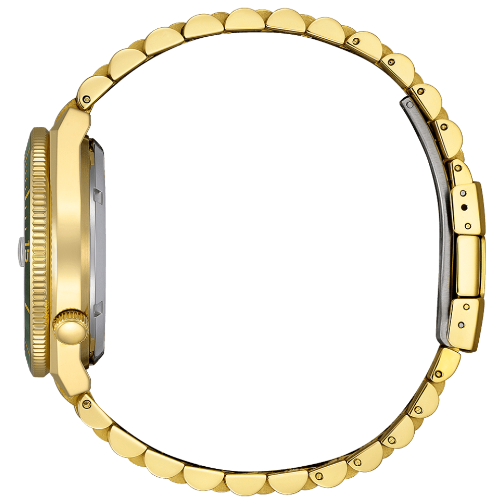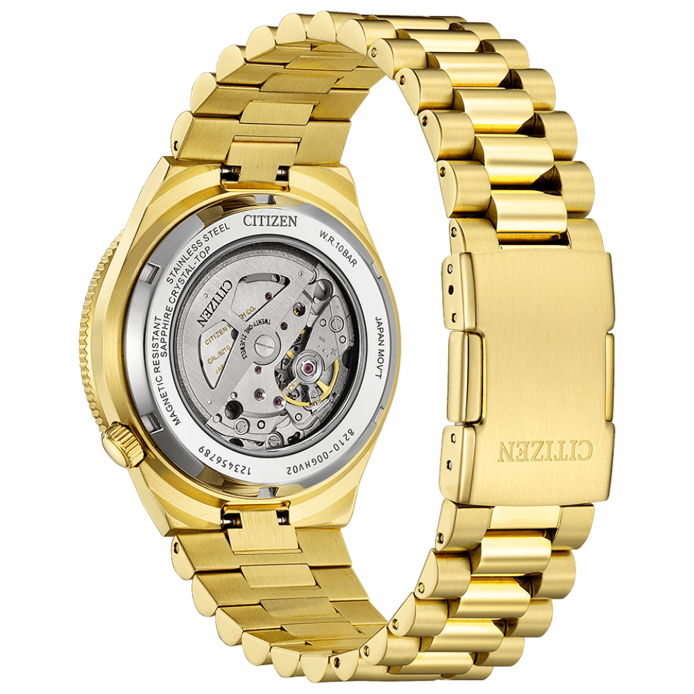 Citizen Collection TSUYOSA NJ0232-53X - men's watch made by Citizen. It has Japanese automatic movement and 8210 calibre. Stainless steel, gold plated case of round shape. Case dimensions are 40 mm. in diameter and 12.5 mm. in thickness. The dial of this Citizen watch is dark green. Display type: analog. This timepiece has sapphire glass. Stainless steel, gold plated band, band color: gold. 100 m. water resistance. The watch is from Citizen Collection collection. The following features are equipped: glowing hands, glowing markers, antimagnetic, date.