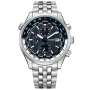 Citizen Collection Wena 3 Equipped Model CA0087-63E - men's watch made by Citizen. It has Japanese solar quartz movement and B612 calibre. Stainless steel case of round shape. Case dimensions are 42.6 mm. in diameter and 11.7 mm. in thickness. The dial of this Citizen watch is black. Display type: analog. This timepiece has mineral glass. Stainless steel band, band color: silver. 50 m. water resistance. The watch is from Citizen Collection collection. The following features are equipped: glowing hands, glowing markers, date, chronograph, world time.