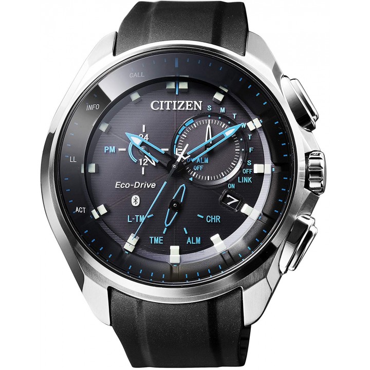 CITIZEN ECO-DRIVE BLUETOOTH BZ1020-22E - men's watch manufactured by Citizen. It has Japanese solar quartz movement and W770 calibre. Stainless steel case of round shape. Case dimensions are 48 mm. in diameter and 15.5 mm. in thickness. The dial of this Citizen watch is black. Display type: analog. This timepiece has sapphire, antireflection coating glass. Polymer band, band color: black. 100 m. water resistance. The watch is from Citizen Collection collection. The following features are equipped: date, day, alarm, chronograph, glowing hands, glowing markers, power reserve indicator, bluetooth.