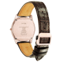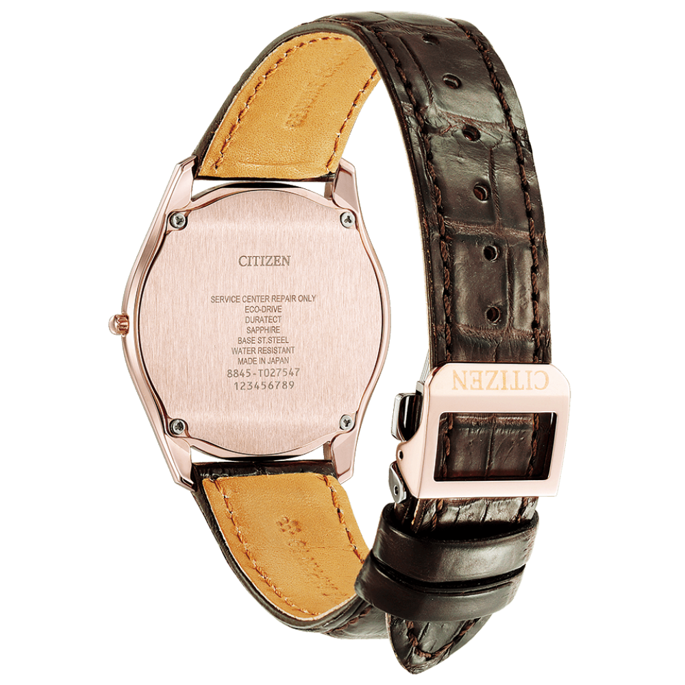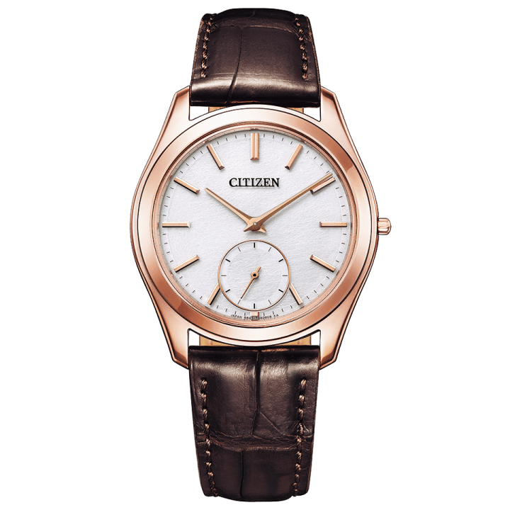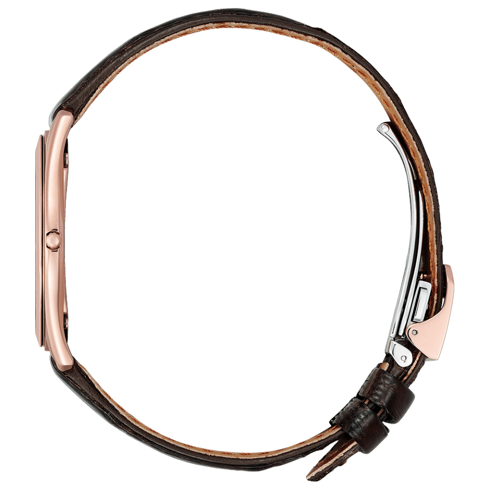 Citizen Eco-Drive One AQ5012-14A - men's watch manufactured by Citizen. It has Japanese solar quartz movement and 8845 calibre. Stainless steel, gold plated case of round shape. Case dimensions are 36.6 mm. in diameter and 4.47 mm. in thickness. The dial of this Citizen watch is white. Display type: analog. This timepiece has sapphire, clarity coating glass. Crocodile band, band color: brown. 30 m. water resistance. The watch is from Eco-Drive One collection.