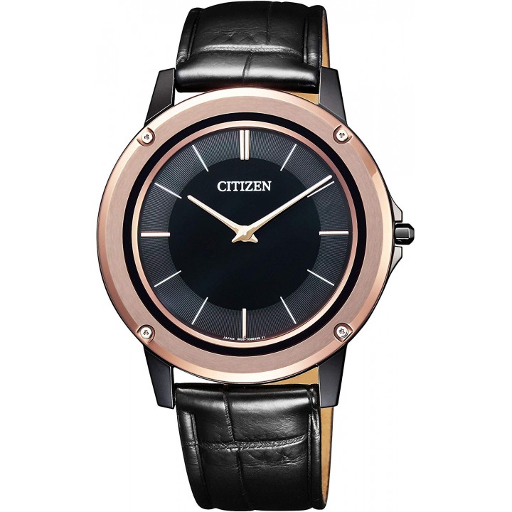 Citizen Eco-Drive One AR5025-08E - men's watch produced by Citizen. It is equipped with Japanese solar quartz movement and 8826 calibre. Stainless steel, hard coating, ceramic case of round shape. Case dimensions are 39 mm. in diameter and 2.98 mm. in thickness. The dial of this Citizen watch is black. Display type: analog. This timepiece has sapphire, super clear coating glass. Crocodile leather band, band color: black. 30 m. water resistance. The watch is from Eco-Drive One collection.