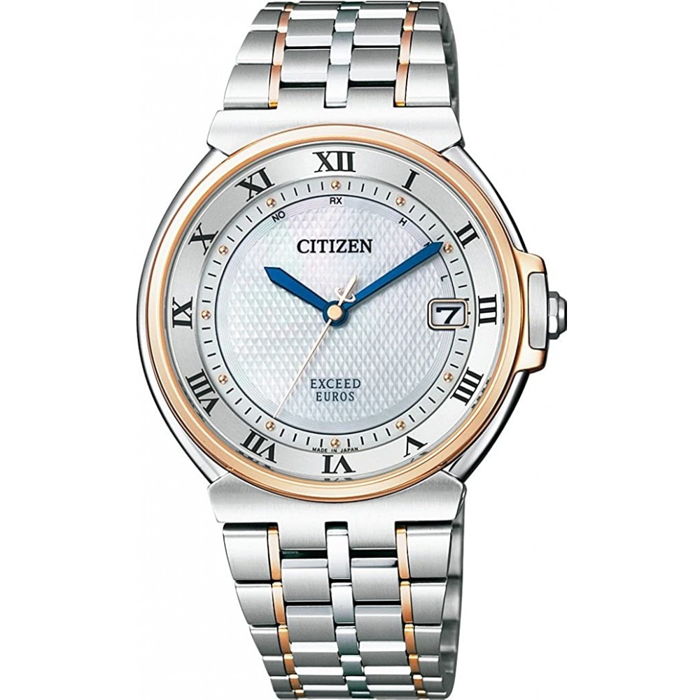 Citizen Esceed Euros AS7074-57A - men's watch produced by Citizen. It is equipped with Japanese solar quartz movement and H111 calibre. Stainless steel, hard coating, gold plated case of round shape. Case dimensions are 38 mm. in diameter and 8.35 mm. in thickness. The dial of this Citizen watch is mother of pearl. Display type: analog. This timepiece has sapphire, super clear coating glass. Stainless steel, hard coating, gold plated band, band color: silver, gold. 100 m. water resistance. The watch is from Exceed collection. The following features are equipped: date, radio controlled, perpetual calendar, antimagnetic.