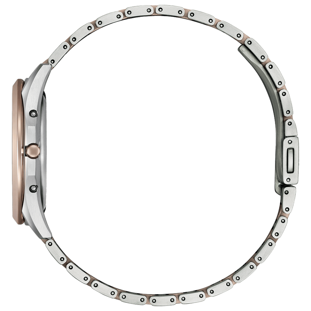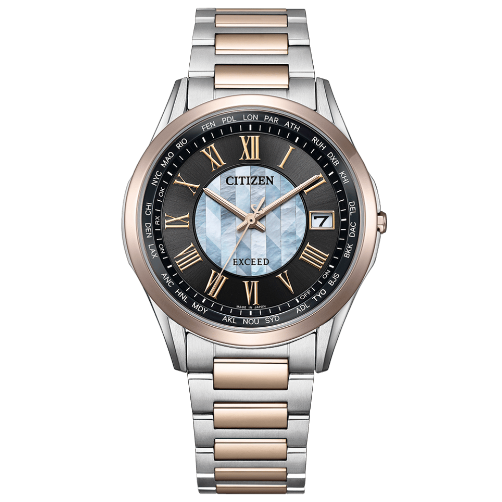 Citizen Exceed "Arrow of Oath" Limited Edition CB1115-68W - men's watch made by Citizen. It is equipped with Japanese solar quartz movement and H149 calibre. Super titanium, duratect sakura pink, duratect treatment case of round shape. Case dimensions are 38 mm. in diameter and 8.5 mm. in thickness. The dial of this Citizen watch is mother of pearl, black. Display type: analog. This timepiece has sapphire, clarity coating glass. Super titanium, duratect sakura pink, duratect treatment band, band color: silver, gold. 50 m. water resistance. The watch is from Exceed collection. The following features are equipped: radio controlled, antimagnetic, power reserve indicator, perpetual calendar, date, world time, limited edition.