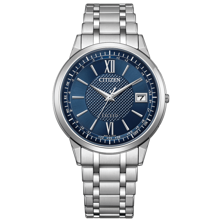 Citizen Exceed CB1140-61L - men's watch produced by Citizen. It is equipped with Japanese solar quartz movement and H147 calibre. Super titanium, duratect treatment case of round shape. Case dimensions are 38 mm. in diameter and 7 mm. in thickness. The dial of this Citizen watch is blue. Display type: analog. This timepiece has sapphire, clarity coating glass. Super titanium band, band color: silver. 30 m. water resistance. The watch is from Exceed collection. The following features are equipped: radio controlled, antimagnetic, power reserve indicator, perpetual calendar, date, world time.