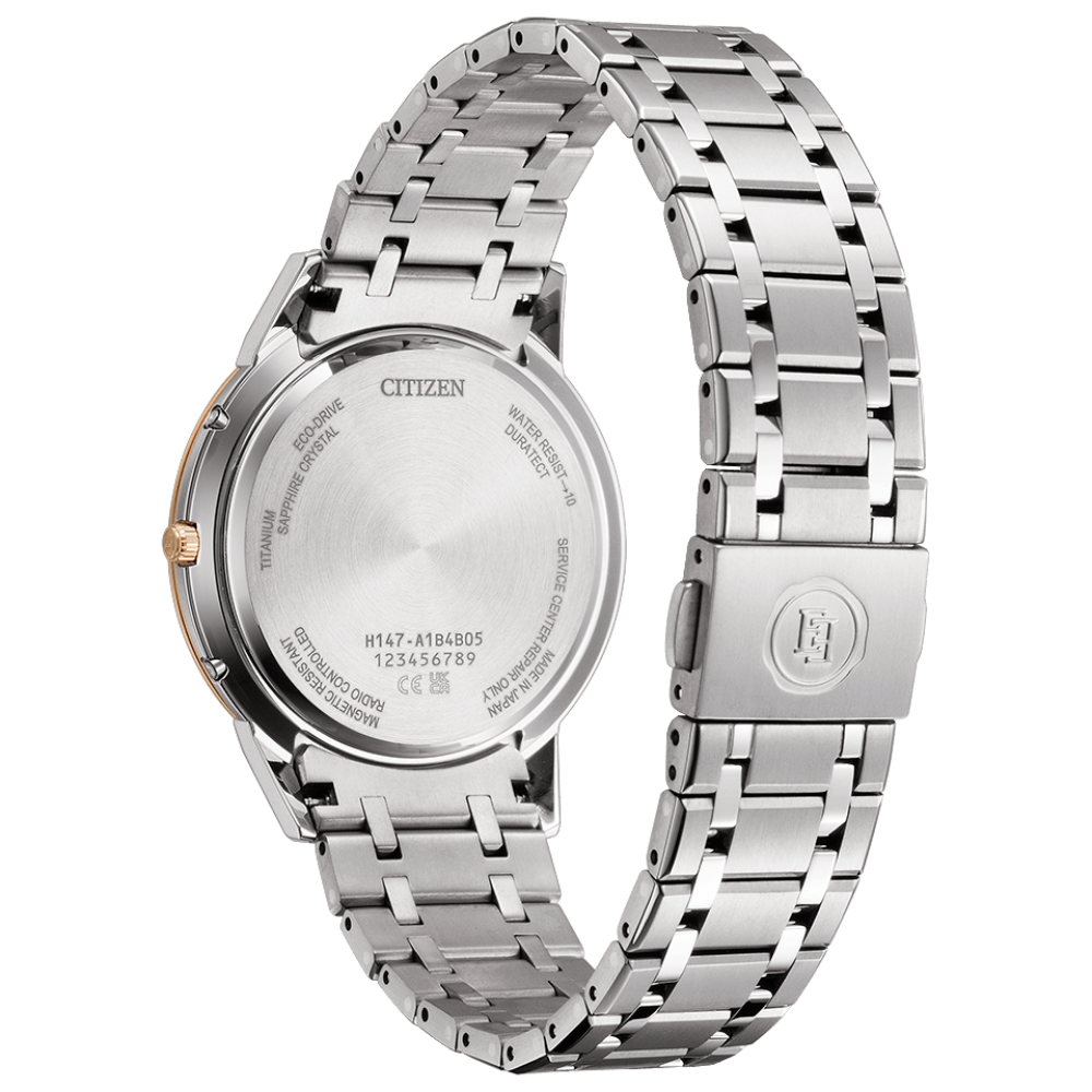 Citizen Exceed CB1145-67A - men's watch made by Citizen. It is equipped with Japanese solar quartz movement and H147 calibre. Super titanium, duratect treatment, duratect sakura pink case of round shape. Case dimensions are 38 mm. in diameter and 7.0 mm. in thickness. The dial of this Citizen watch is beige. Display type: analog. This timepiece has sapphire, clarity coating glass. Super titanium band, band color: silver. 30 m. water resistance. The watch is from Exceed collection. The following features are equipped: radio controlled, antimagnetic, power reserve indicator, perpetual calendar, date, world time.