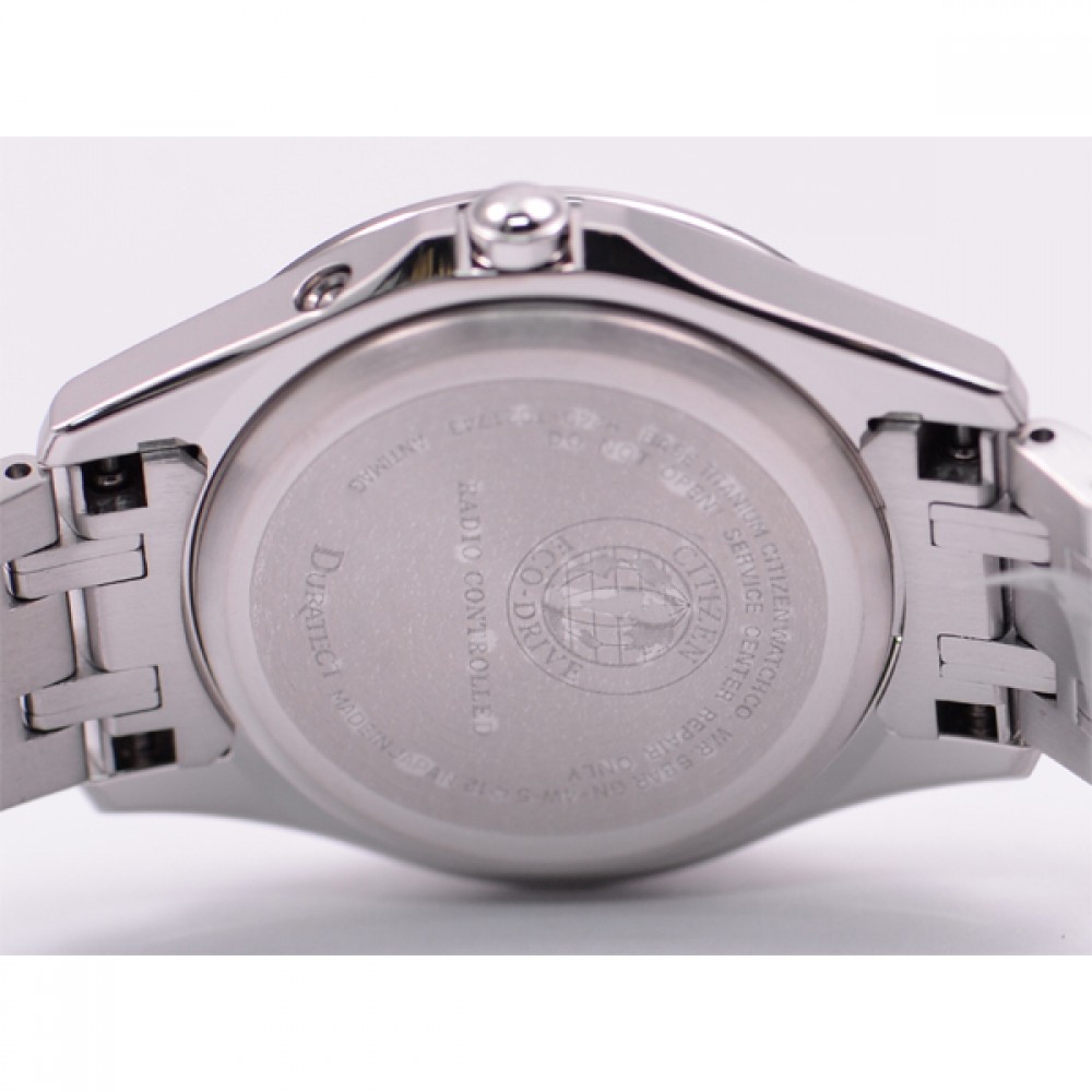 CITIZEN EXCEED EC1120-59B - ladies watch made by Citizen. It is equipped with Japanese solar quartz movement and H240 calibre. Titanium, hard coating case of round shape. Case dimensions are 29.2 mm. in diameter and 8.1 mm. in thickness. The dial of this Citizen watch is silver. Display type: analog. This timepiece has sapphire, super clear coating glass. Titanium, hard coating band, band color: silver. 50 m. water resistance. The watch is from Exceed collection. The following features are equipped: antimagnetic, date, perpetual calendar, radio controlled, world time.