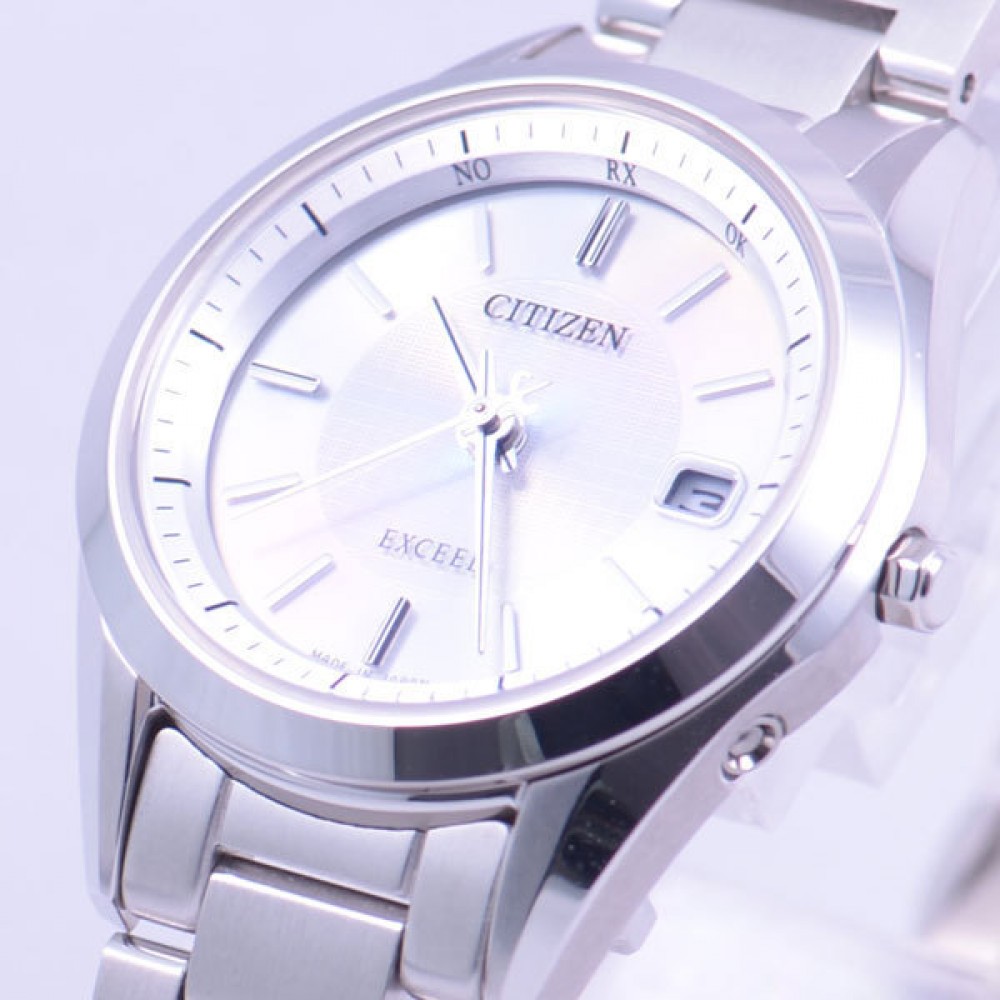 CITIZEN EXCEED ES1040-52A - ladies watch manufactured by Citizen. It is equipped with Japanese solar quartz movement and H050 calibre. Titanium, hard coating case of round shape. Case dimensions are 27 mm. in diameter and 7.8 mm. in thickness. The dial of this Citizen watch is silver. Display type: analog. This timepiece has sapphire, super clear coating glass. Titanium, hard coating band, band color: silver. 50 m. water resistance. The watch is from Exceed collection. The following features are equipped: antimagnetic, date, radio controlled, perpetual calendar.