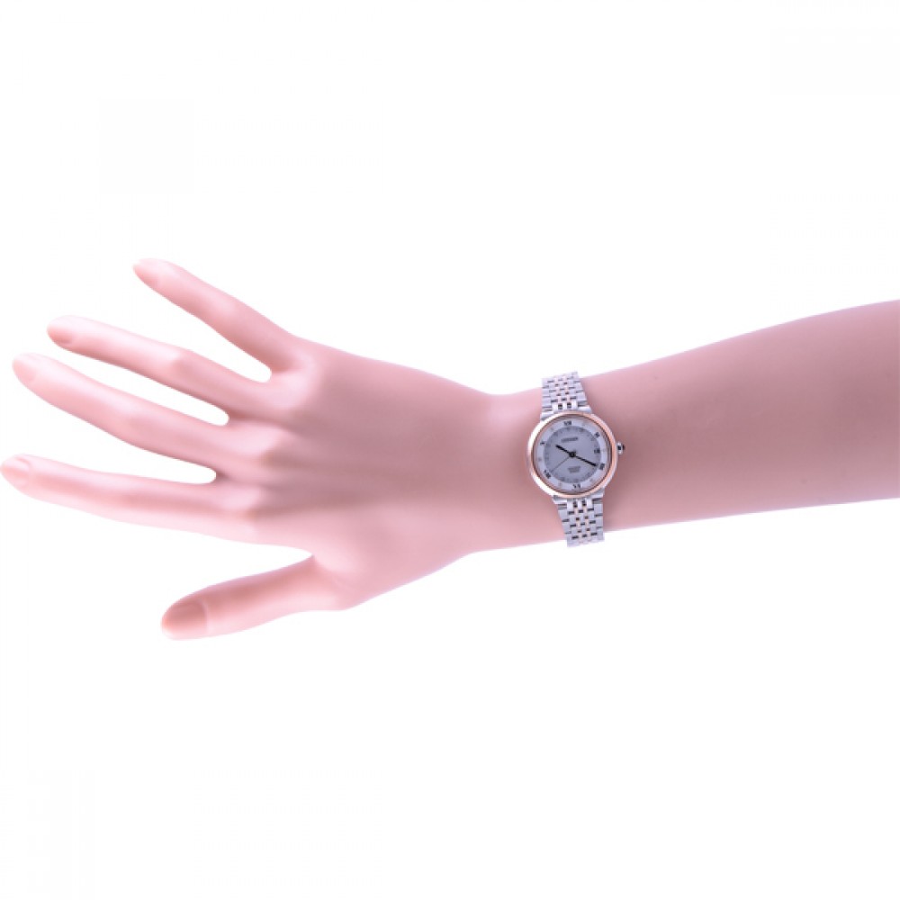 CITIZEN EXCEED ES1055-55W - ladies watch made by Citizen. It has Japanese solar quartz movement and H240 calibre. Stainless steel, hard coating, gold plated case of round shape. Case dimensions are 28.5 mm. in diameter and 7.6 mm. in thickness. The dial of this Citizen watch is white. Display type: analog. This timepiece has sapphire, super clear coating glass. Stainless steel, hard coating, gold plated band, band color: silver, gold. 50 m. water resistance. The watch is from Exceed collection. The following features are equipped: radio controlled, antimagnetic, date, perpetual calendar, world time, diamond set.