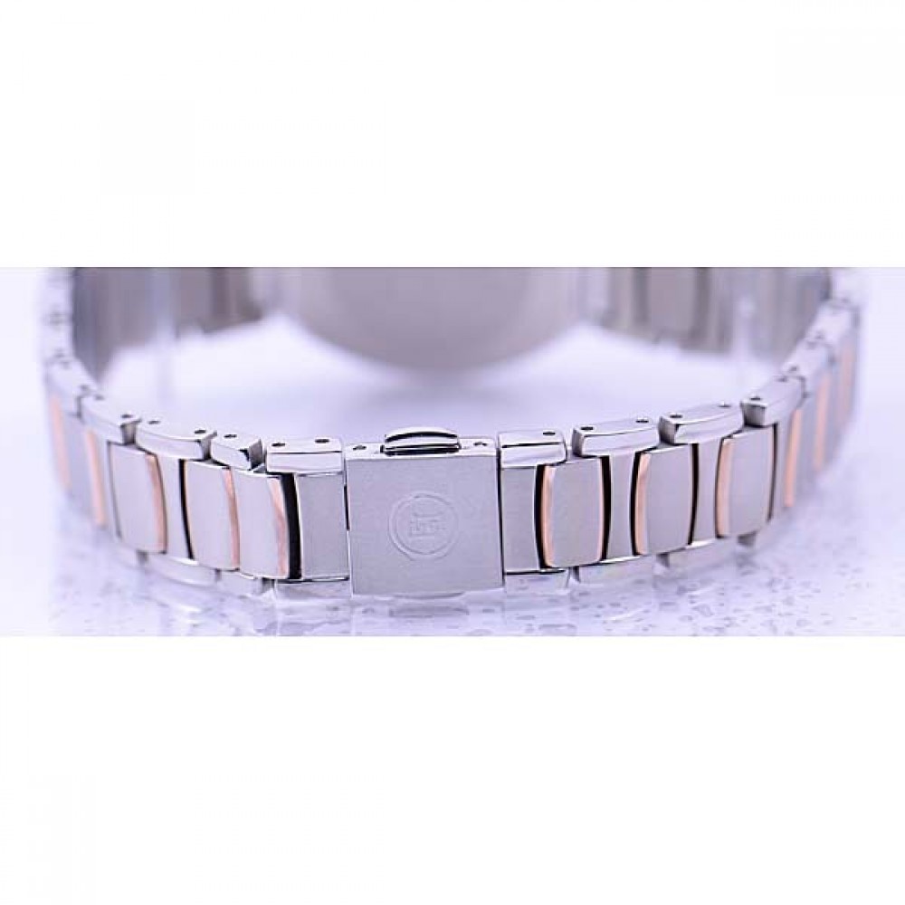 CITIZEN EXCEED ES8144-59A - ladies watch produced by Citizen. It has Japanese solar quartz movement and 8845 calibre. Titanium, hard coating, gold plated case of tonneau shape. Case dimensions are 25 mm. in diameter and 7.5 mm. in thickness. The dial of this Citizen watch is white. Display type: analog. This timepiece has sapphire, super clear coating glass. Titanium, hard coating, gold plated band, band color: silver, gold. 50 m. water resistance. The watch is from Exceed collection. The following features are equipped: antimagnetic, date, perpetual calendar, radio controlled.