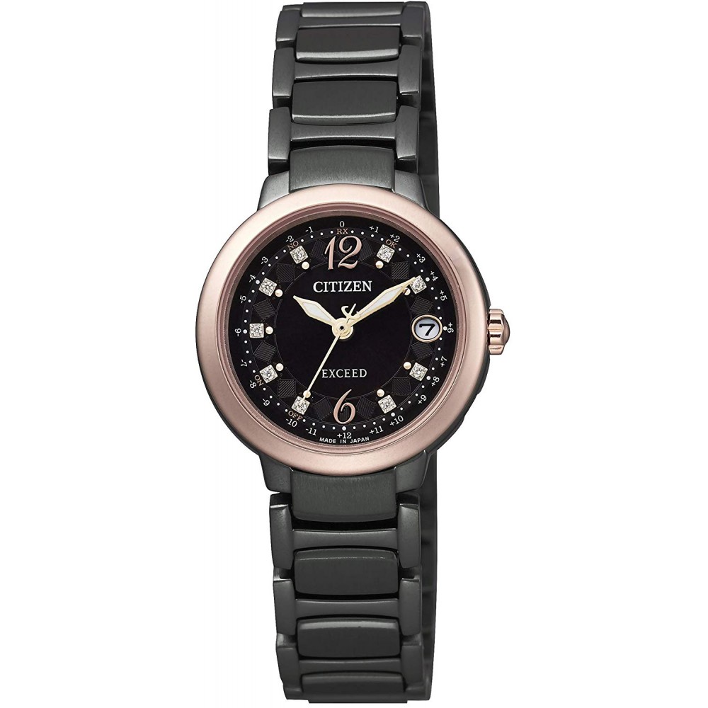 CITIZEN EXCEED ES9326-56E - ladies watch manufactured by Citizen. It is equipped with Japanese solar quartz movement and H060 calibre. Titanium, hard coating, gold plated case of round shape. Case dimensions are 25.5 mm. in diameter and 7.4 mm. in thickness. The dial of this Citizen watch is black. Display type: analog. This timepiece has sapphire, super clear coating glass. Titanium, hard coating band, band color: black. 50 m. water resistance. The watch is from Exceed collection. The following features are equipped: date, radio controlled, perpetual calendar, world time, antimagnetic, diamond set, glowing hands, limited edition.