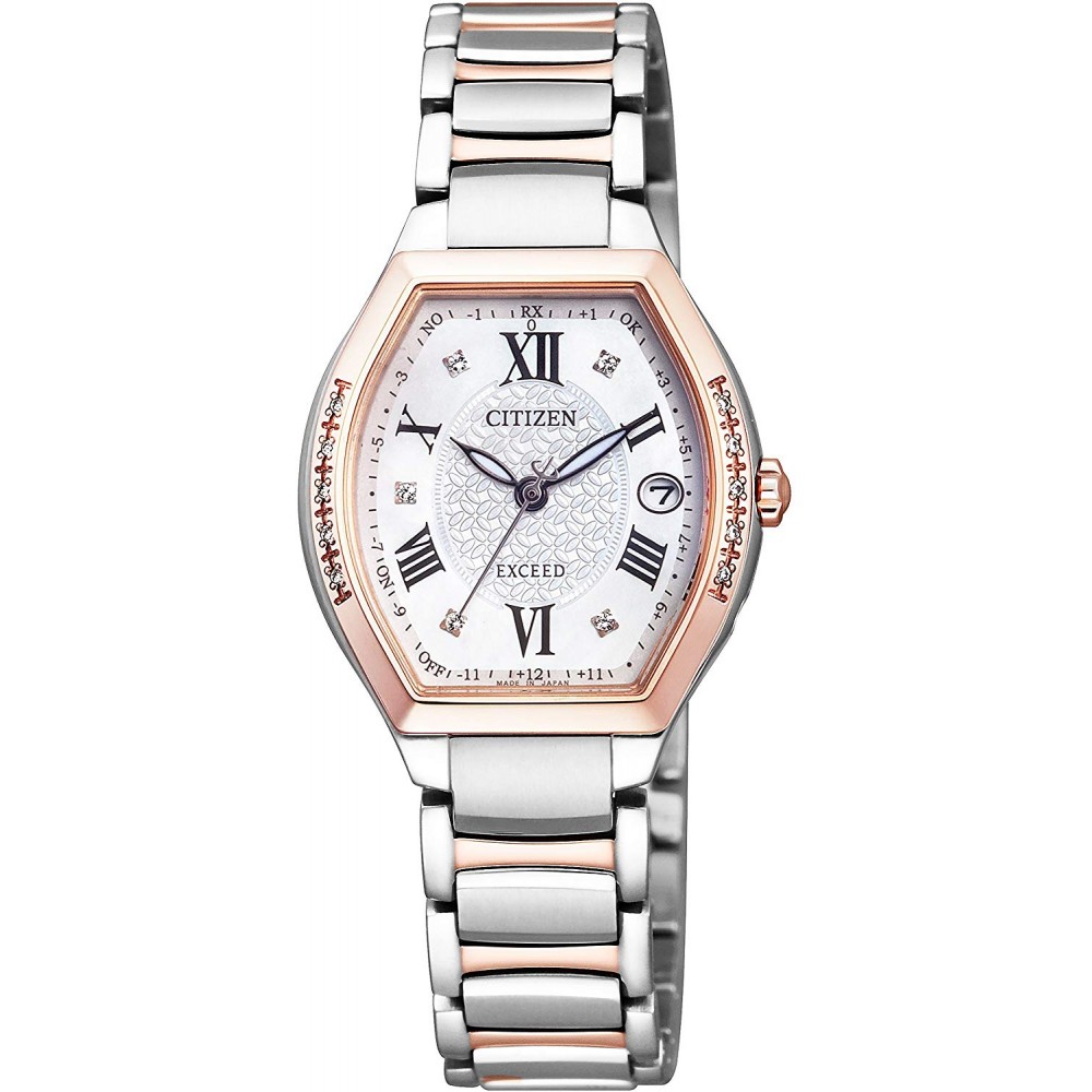 CITIZEN EXCEED ES9384-50W - ladies watch produced by Citizen. It is equipped with Japanese solar quartz movement and H060 calibre. Titanium, gold plated, hard coating case of tonneau shape. Case dimensions are 26.2 mm. in diameter and 8.5 mm. in thickness. The dial of this Citizen watch is white. Display type: analog. This timepiece has sapphire, super clear coating glass. Titanium, hard coating, gold plated band, band color: silver, gold. 50 m. water resistance. The watch is from Exceed collection. The following features are equipped: date, radio controlled, perpetual calendar, antimagnetic, world time, diamond set, limited edition.