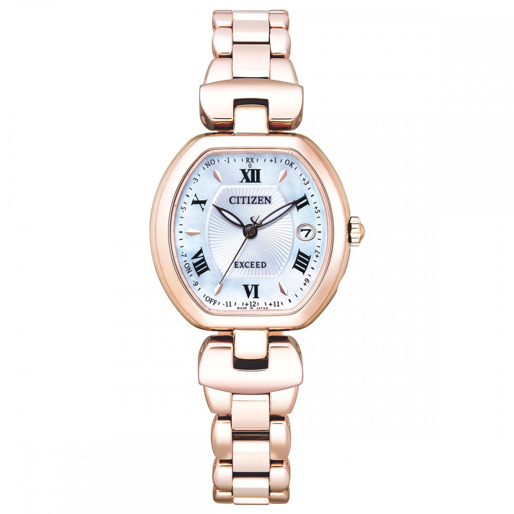 Citizen Exceed ES9454-56A - ladies watch made by Citizen. It has Japanese solar quartz movement and H060 calibre. Titanium, gold plated case of tonneau shape. Case dimensions are 26.6 mm. in diameter and 8.1 mm. in thickness. The dial of this Citizen watch is mother of pearl. Display type: analog. This timepiece has sapphire, super clear coating glass. Titanium, gold plated band, band color: gold. 50 m. water resistance. The watch is from Exceed collection. The following features are equipped: radio controlled, perpetual calendar, power reserve indicator, world time, date, antimagnetic, glowing hands.