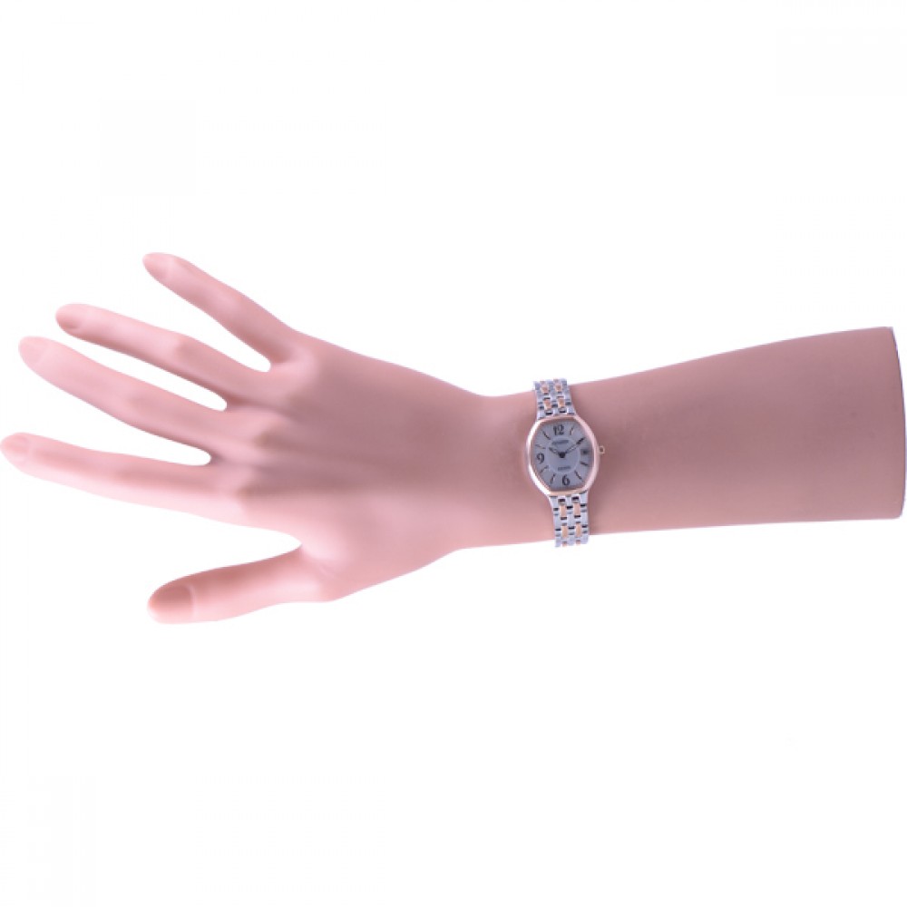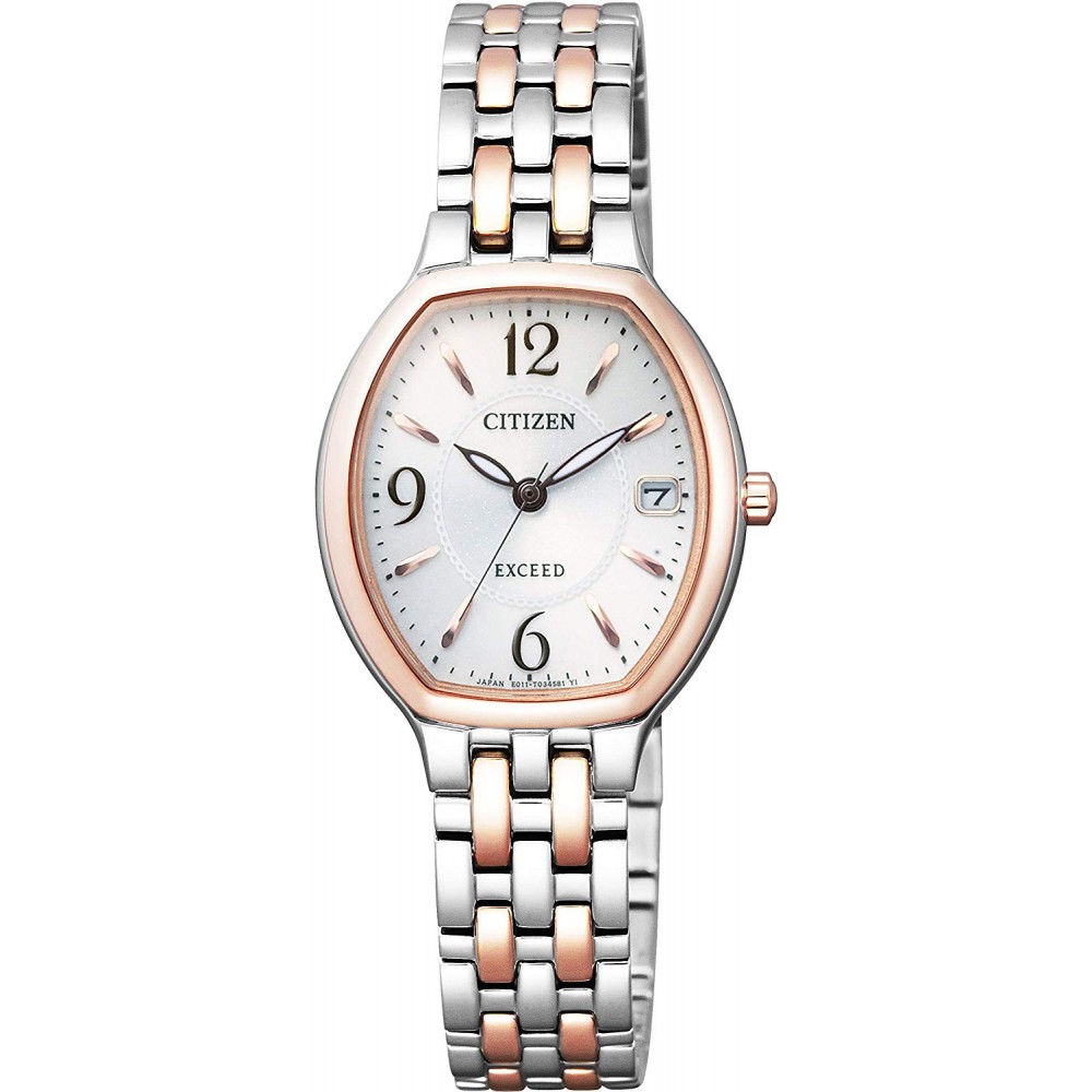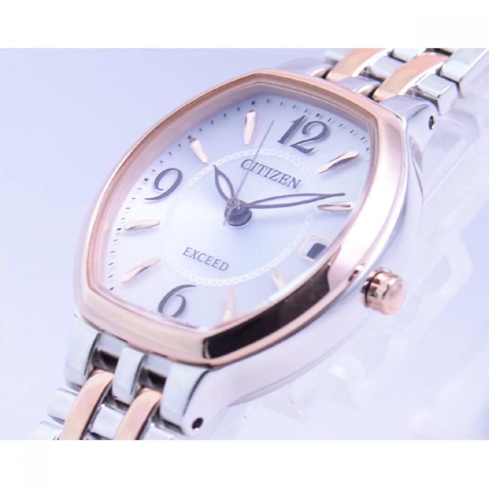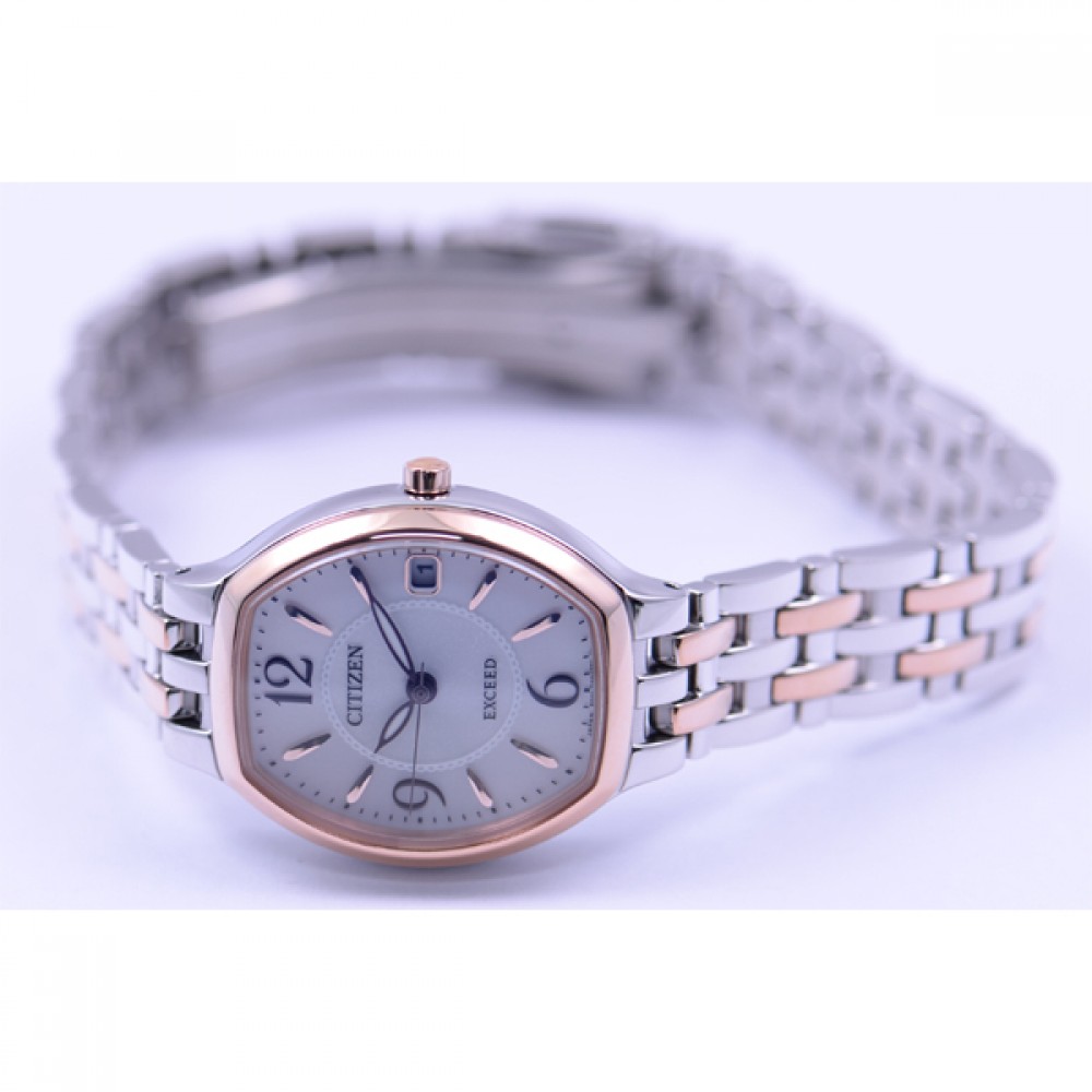 CITIZEN EXCEED EW2434-56A - ladies watch made by Citizen. It has Japanese solar quartz movement and E011 calibre. Stainless steel, hard coating, gold plated case of round shape. Case dimensions are 24 mm. in diameter and 8.2 mm. in thickness. The dial of this Citizen watch is silver. Display type: analog. This timepiece has sapphire, antireflection coating glass. Stainless steel, hard coating, gold plated band, band color: silver, gold. 50 m. water resistance. The watch is from Exceed collection. The following features are equipped: date, glowing hands.