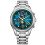Citizen Exceed Limited Edition BY1020-61W - men's watch produced by Citizen. It has Japanese solar quartz movement and H874 calibre. Super titanium, duratect treatment case of round shape. Case dimensions are 41 mm. in diameter and 11.9 mm. in thickness. The dial of this Citizen watch is blue. Display type: analog. This timepiece has sapphire, clarity coating glass. Super titanium band, band color: silver. 100 m. water resistance. The watch is from Exceed collection. The following features are equipped: radio controlled, antimagnetic, glowing hands, power reserve indicator, perpetual calendar, date, day, moon phase, world time, limited edition.