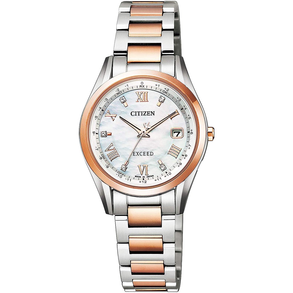 Citizen Exceed Limited Edition ES9374-61W - ladies watch produced by Citizen. It is equipped with Japanese solar quartz movement and H060 calibre. Titanium, hard coating, gold plated case of round shape. Case dimensions are 26.6 mm. in diameter and 7.7 mm. in thickness. The dial of this Citizen watch is mother of pearl. Display type: analog. This timepiece has sapphire, super clear coating glass. Titanium, hard coating, gold plated band, band color: silver, gold. 50 m. water resistance. The watch is from Exceed collection. The following features are equipped: perpetual calendar, date, radio controlled, world time, antimagnetic, limited edition, diamond set.