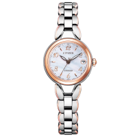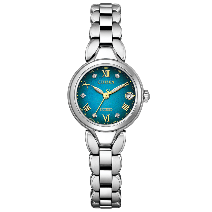 Citizen Exceed Limited Edition ES9470-68W - ladies watch produced by Citizen. It is equipped with Japanese solar quartz movement and H060 calibre. Super titanium, duratect treatment case of round shape. Case dimensions are 24.8 mm. in diameter and 7.9 mm. in thickness. The dial of this Citizen watch is blue. Display type: analog. This timepiece has sapphire, clarity coating glass. Super titanium band, band color: silver. 50 m. water resistance. The watch is from Exceed collection. The following features are equipped: radio controlled, antimagnetic, glowing hands, diamond set, power reserve indicator, perpetual calendar, date, world time, limited edition.