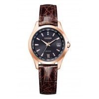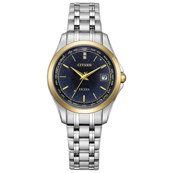 Citizen Exceed Milky Way Limited Edition EC1127-68L - ladies watch made by Citizen. It has Japanese solar quartz movement and H246 calibre. Super titanium, duratect treatment, duratect gold case of round shape. Case dimensions are 29.2 mm. in diameter and 8.1 mm. in thickness. The dial of this Citizen watch is dark blue. Display type: analog. This timepiece has sapphire, clarity coating glass. Super titanium band, band color: silver. 50 m. water resistance. The watch is from Exceed collection. The following features are equipped: radio controlled, antimagnetic, power reserve indicator, perpetual calendar, date, world time, limited edition, diamond set.