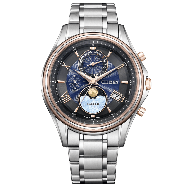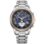 Citizen Exceed The Road of the Moon Limited Edition BY1026-65F - men's watch produced by Citizen. It has Japanese solar quartz movement and H874 calibre. Super titanium, duratect sakura pink, duratect treatment case of round shape. Case dimensions are 41 mm. in diameter and 11.9 mm. in thickness. The dial of this Citizen watch is black, blue, mother of pearl. Display type: analog. This timepiece has sapphire, clarity coating glass. Super titanium band, band color: silver. 100 m. water resistance. The watch is from Exceed collection. The following features are equipped: radio controlled, antimagnetic, power reserve indicator, perpetual calendar, day, date, moon phase, world time, limited edition.