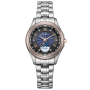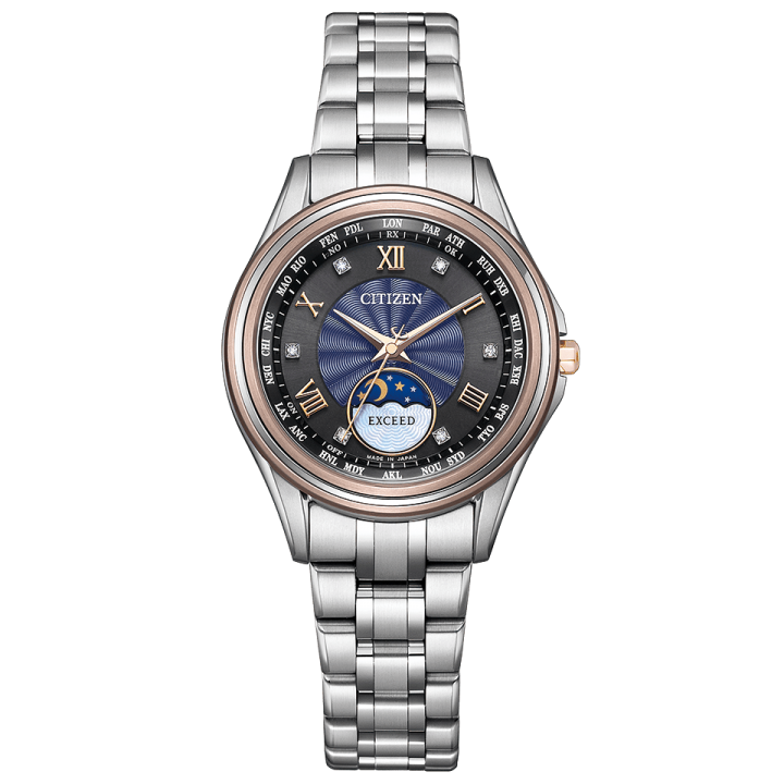 Citizen Exceed The Road of the Moon Limited Edition EE1016-66F - ladies watch made by Citizen. It has Japanese solar quartz movement and H296 calibre. Super titanium, duratect sakura pink, duratect treatment case of round shape. Case dimensions are 29.2 mm. in diameter and 8.8 mm. in thickness. The dial of this Citizen watch is black, blue, mother of pearl. Display type: analog. This timepiece has sapphire, clarity coating glass. Super titanium band, band color: silver. 50 m. water resistance. The watch is from Exceed collection. The following features are equipped: radio controlled, antimagnetic, diamond set, power reserve indicator, world time, limited edition.