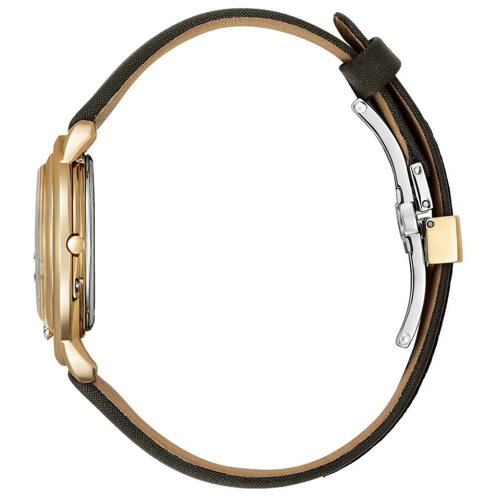 Citizen L ARCLY Collection Limited Model EW5522-46E - ladies watch made by Citizen. It has Japanese solar quartz movement and B036 calibre. Stainless steel, gold plated case of round shape. Case dimensions are 32.5 mm. in diameter and 8.3 mm. in thickness. The dial of this Citizen watch is black, brown. Display type: analog. This timepiece has sapphire glass. Fabric band, band color: khaki. 50 m. water resistance. The watch is from Citizen L collection. The following features are equipped: diamond set, limited edition.
