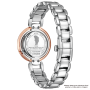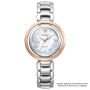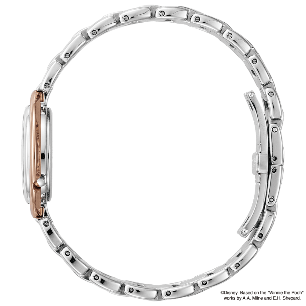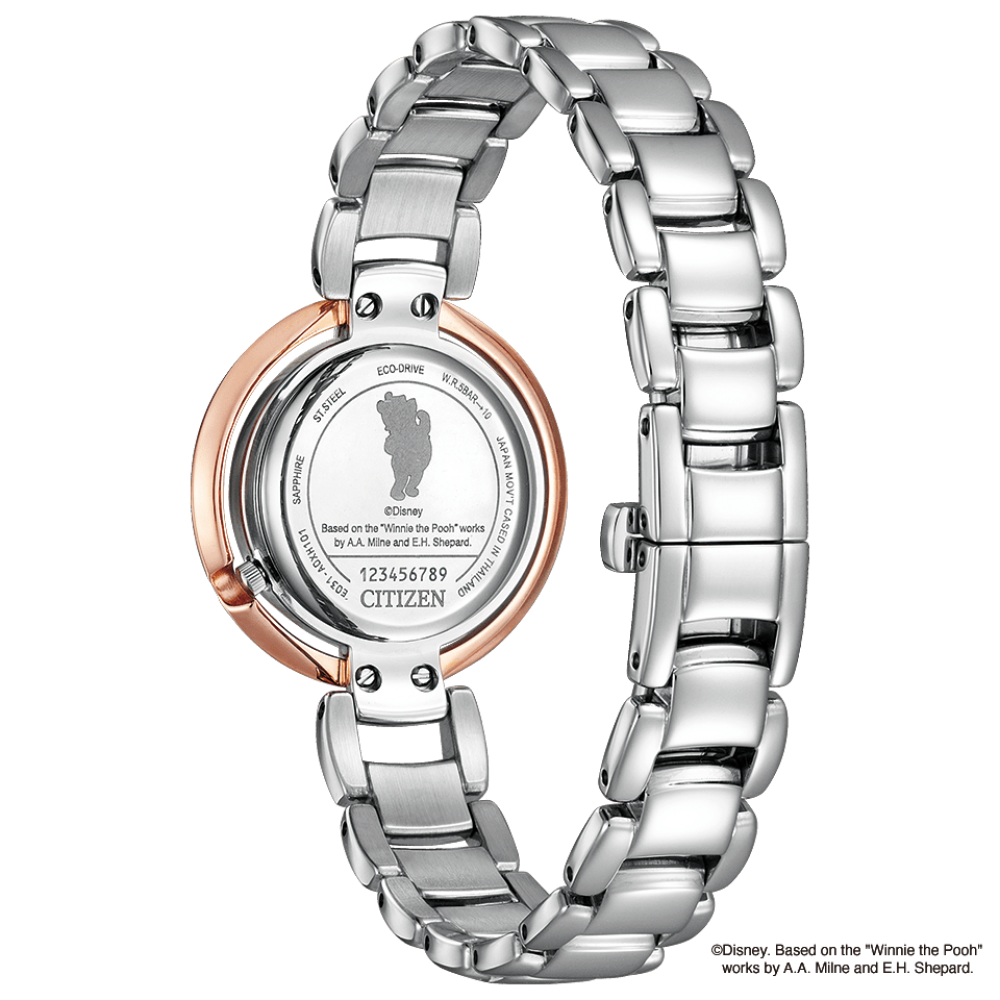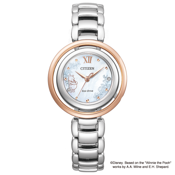 Citizen L Disney Collection Limited Edition EM0667-60D - ladies watch manufactured by Citizen. It is equipped with Japanese solar quartz movement and E031 calibre. Stainless steel, gold plated case of round shape. Case dimensions are 30.5 mm. in diameter and 7.4 mm. in thickness. The dial of this Citizen watch is white, mother of pearl. Display type: analog. This timepiece has sapphire glass. Stainless steel band, band color: silver. 50 m. water resistance. The watch is from Citizen L collection. The following features are equipped: diamond set, limited edition.