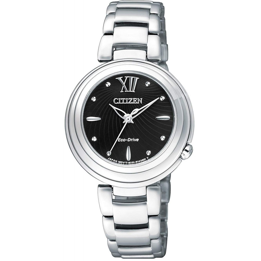 CITIZEN L EM0338-88E - ladies watch produced by Citizen. It has Japanese solar quartz movement and E031 calibre. Stainless steel case of round shape. Case dimensions are 30.2 mm. in diameter and 7.2 mm. in thickness. The dial of this Citizen watch is black. Display type: analog. This timepiece has sapphire glass. Stainless steel band, band color: silver. 50 m. water resistance. The watch is from Citizen L collection.