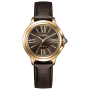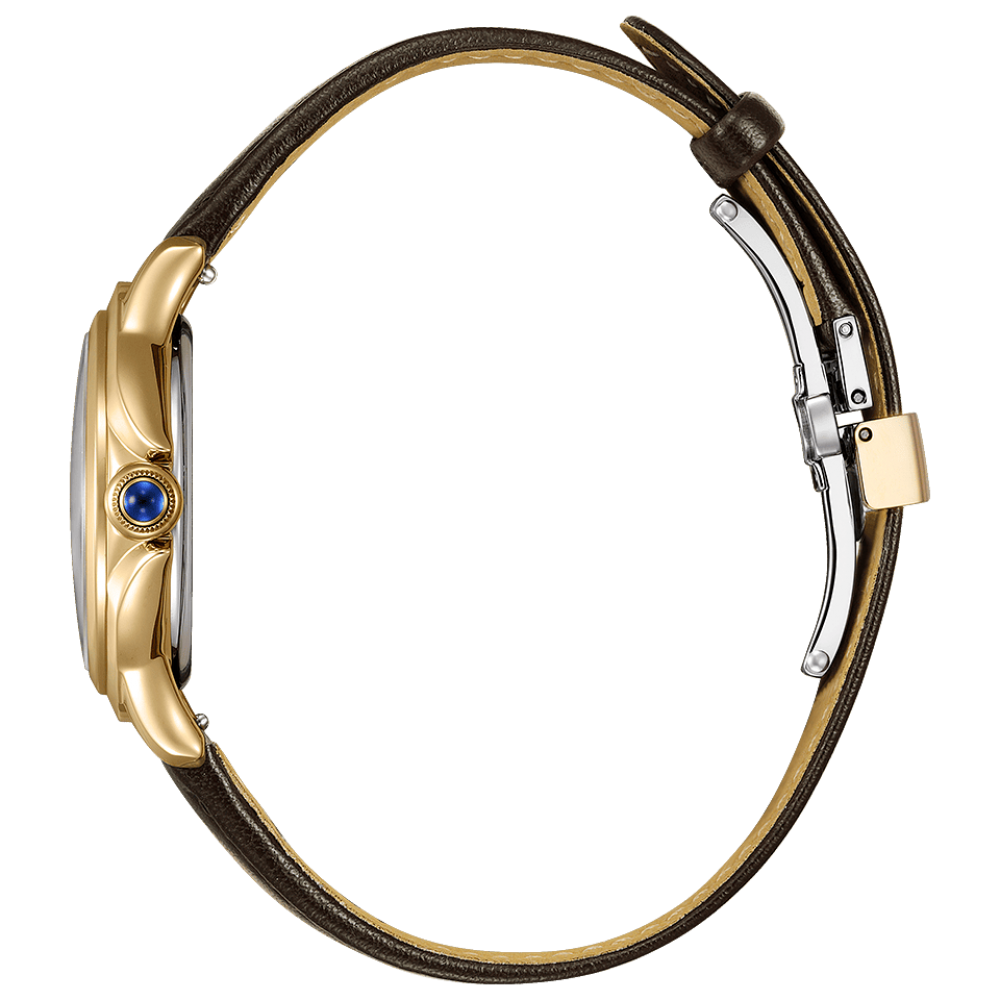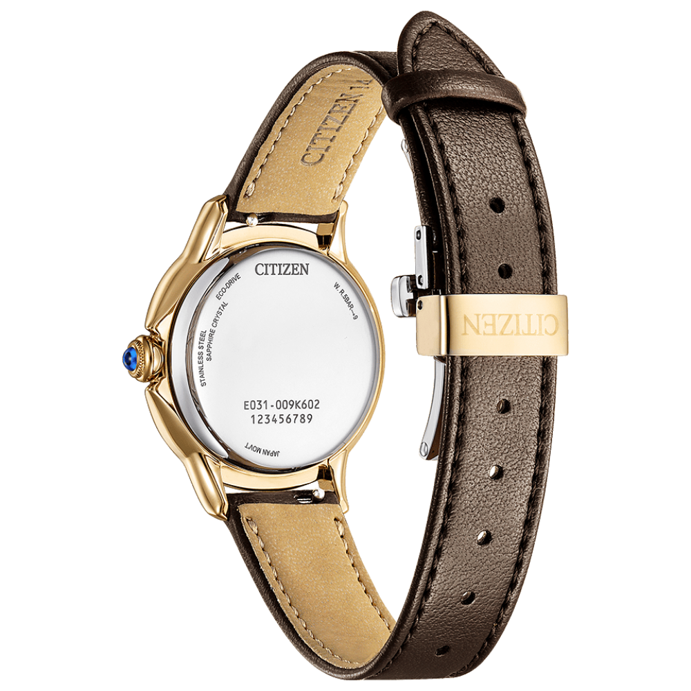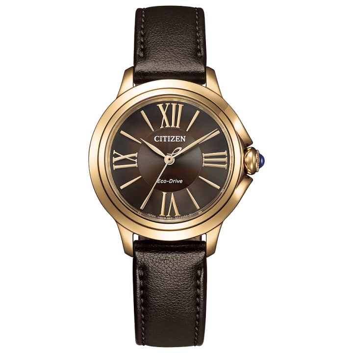 Citizen L ROUND Collection EM1163-09X - ladies watch made by Citizen. It has Japanese solar quartz movement and E031 calibre. Stainless steel, gold plated case of round shape. Case dimensions are 30.3 mm. in diameter and 8.7 mm. in thickness. The dial of this Citizen watch is brown. Display type: analog. This timepiece has sapphire glass. Synthetic leather band, band color: brown. 50 m. water resistance. The watch is from Citizen L collection.