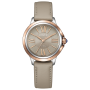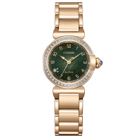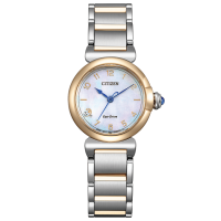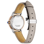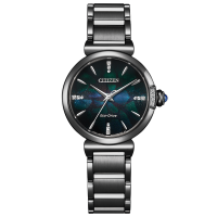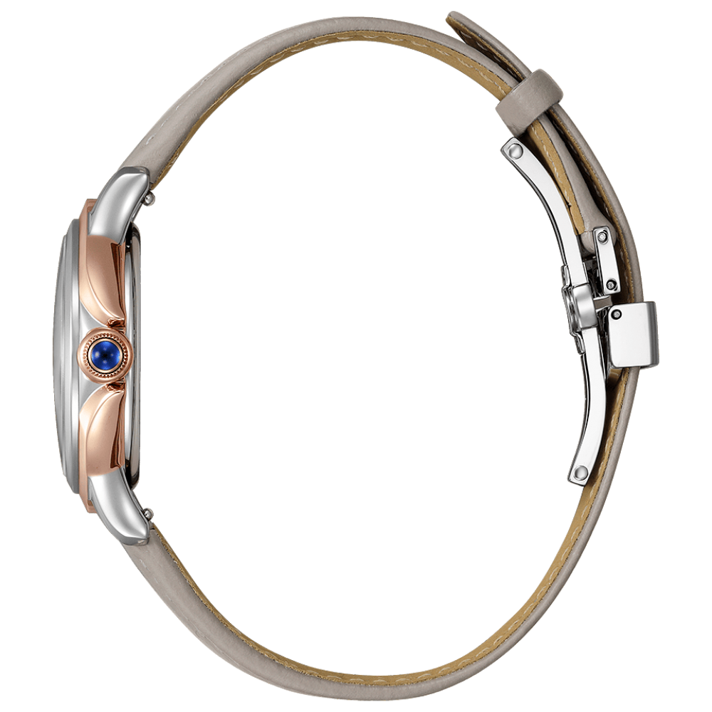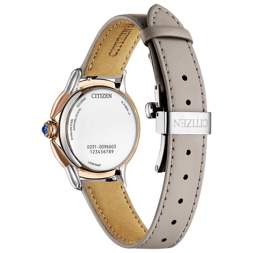 Citizen L ROUND Collection EM1166-01Z - ladies watch manufactured by Citizen. It has Japanese solar quartz movement and E031 calibre. Stainless steel, gold plated case of round shape. Case dimensions are 30.3 mm. in diameter and 8.7 mm. in thickness. The dial of this Citizen watch is gray. Display type: analog. This timepiece has sapphire glass. Synthetic leather band, band color: gray. 50 m. water resistance. The watch is from Citizen L collection.