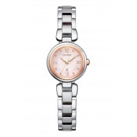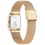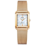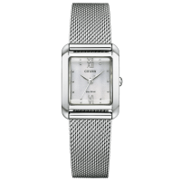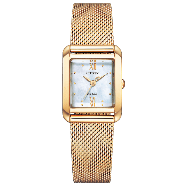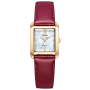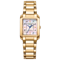Citizen L Square Collection EW5593-64D - ladies watch manufactured by Citizen. It has Japanese solar quartz movement and B035 calibre. Stainless steel, gold plated case of rectangle shape. Case dimensions are 21.5 mm. in diameter and 7.5 mm. in thickness. The dial of this Citizen watch is mother of pearl. Display type: analog. This timepiece has sapphire glass. Stainless steel, gold plated, synthetic leather (ecopet®) band, band color: gold, red. 50 m. water resistance. The watch is from Citizen L collection.