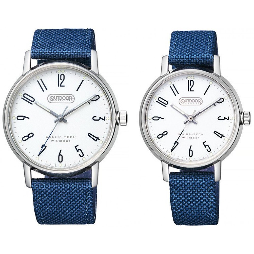 CITIZEN OUTDOOR PAIR KP2-311-14/KP2-418-14 - ladies, men's watches manufactured by Citizen. They have Japanese solar quartz movements and E031 calibre. Stainless steel cases of round shapes. Cases dimensions are 39.2, 32.8 mm. in diameter and 9.1, 8.9 mm. in thickness. The dials of these Citizen watches are white. Display type: analog. These timepieces have mineral glasses. Fabric bands, bands color: blue. 100 m. water resistance. The watches are from Citizen Outdoor collection.