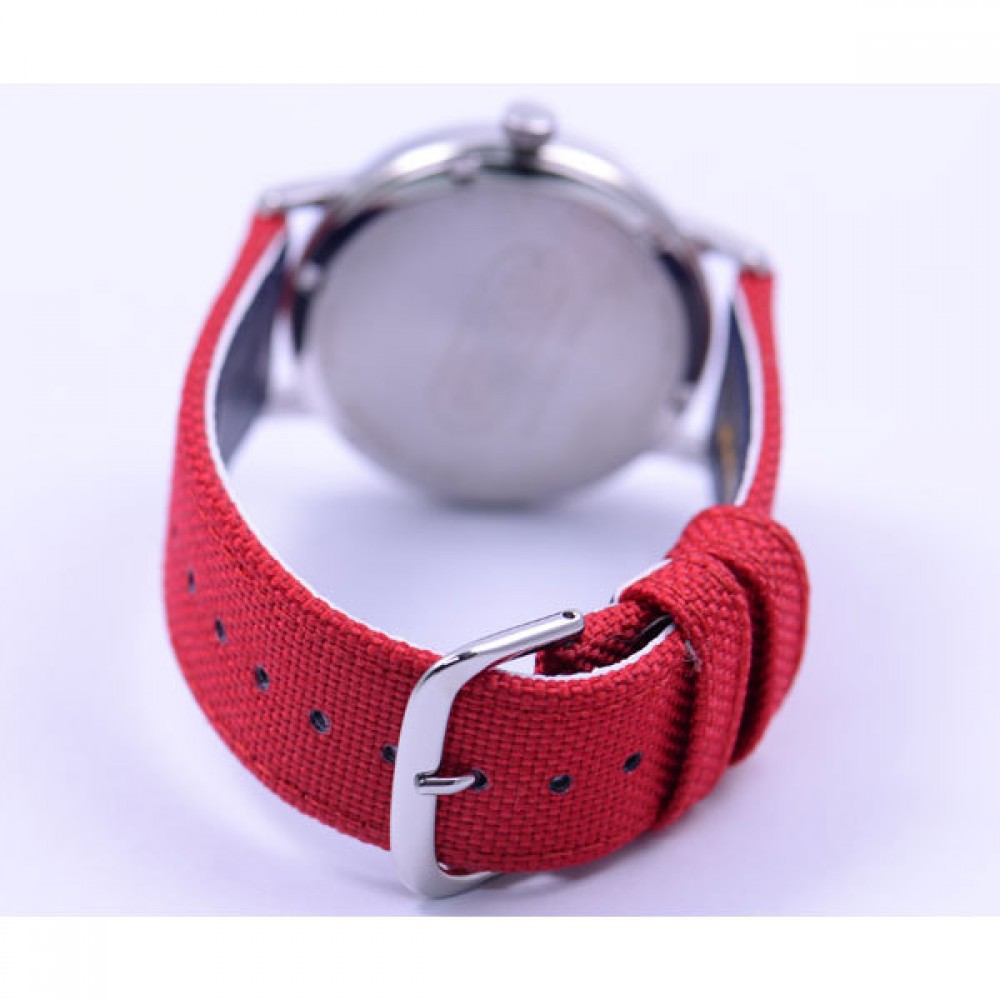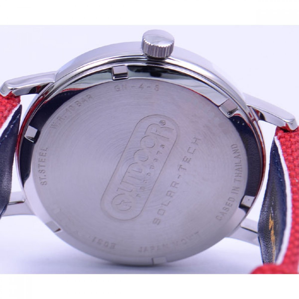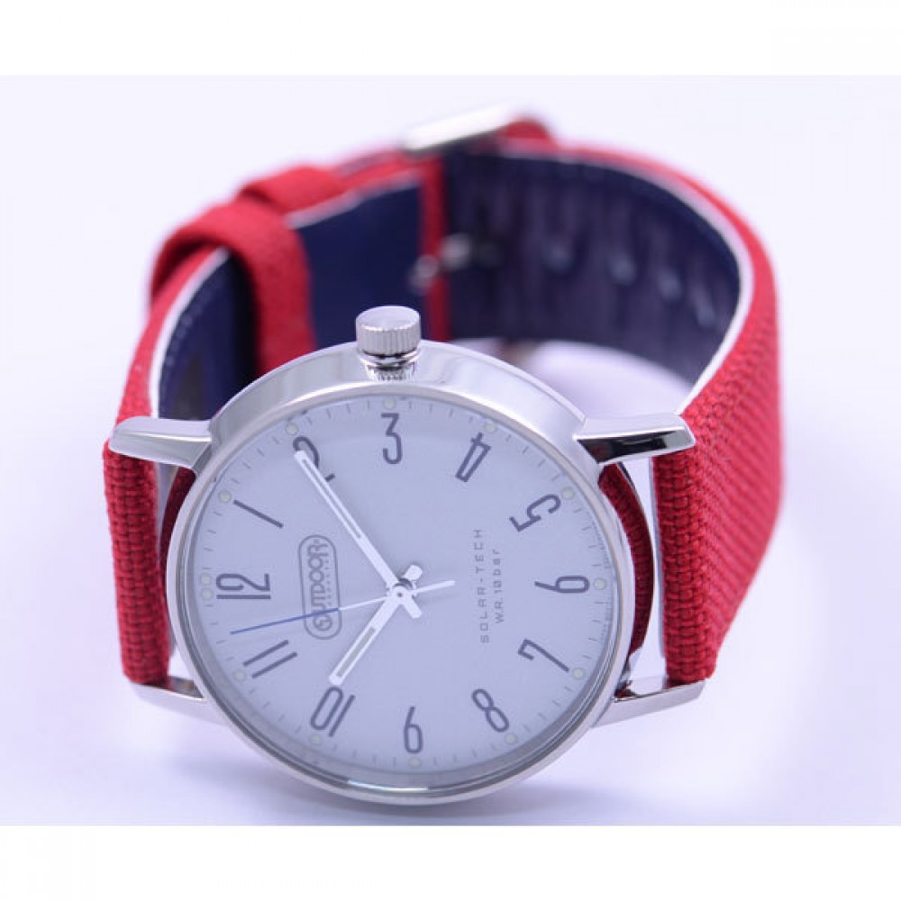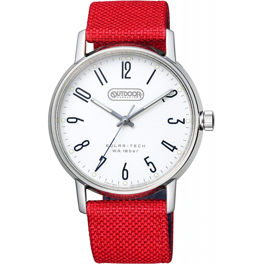 CITIZEN OUTDOOR SOLAR TECH KP2-311-16 - men's watch produced by Citizen. It has Japanese solar quartz movement and E031 calibre. Stainless steel case of round shape. Case dimensions are 39.1 mm. in diameter and 9.1 mm. in thickness. The dial of this Citizen watch is white. Display type: analog. This timepiece has mineral glass. Fabric band, band color: red. 100 m. water resistance. The watch is from Citizen Outdoor collection.