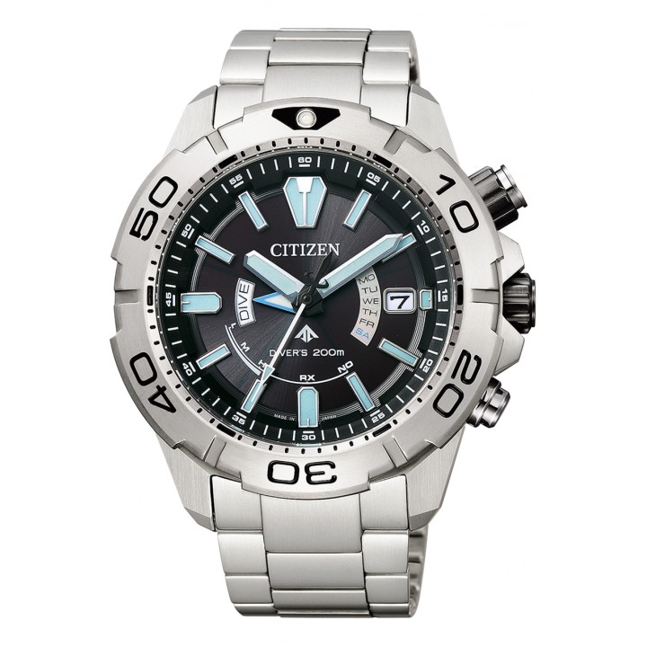 Citizen Promaster AS7141-60E - men's watch made by Citizen. It has Japanese solar quartz movement and H112 calibre. Titanium, hard coating case of round shape. Case dimensions are 43.5 mm. in diameter and 14.1 mm. in thickness. The dial of this Citizen watch is black. Display type: analog. This timepiece has sapphire glass. Titanium, hard coating band, band color: silver. 200 m. water resistance. The watch is from Promaster collection. The following features are equipped: glowing hands, glowing markers, perpetual calendar, antimagnetic, date, day, radio controlled, screw-down crown, power reserve indicator.