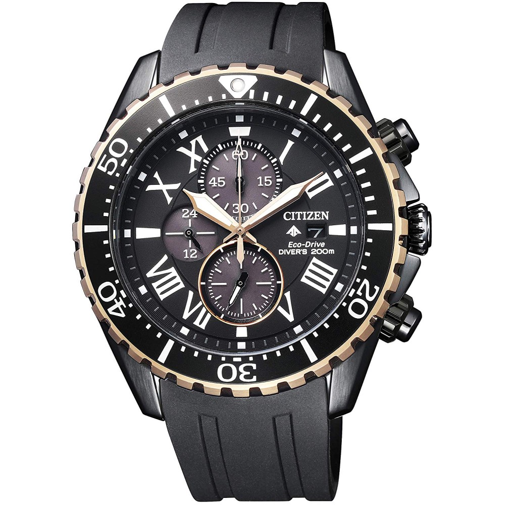 CITIZEN PROMASTER CA0716-19E - men's watch made by Citizen. It is equipped with Japanese solar quartz movement and B612 calibre. Stainless steel, hard coating, gold plated case of round shape. Case dimensions are 44.5 mm. in diameter and 13.8 mm. in thickness. The dial of this Citizen watch is black. Display type: analog. This timepiece has mineral glass. Rubber band, band color: black. 200 m. water resistance. The watch is from Promaster collection. The following features are equipped: antimagnetic, glowing hands, glowing markers, screw-down crown, date, chronograph, limited edition.