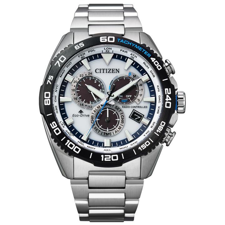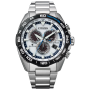 Citizen Promaster Eco-Drive Land CB5034-91A - men's watch produced by Citizen. It is equipped with Japanese solar quartz movement and E660 calibre. Stainless steel case of round shape. Case dimensions are 44.6 mm. in diameter and 12.6 mm. in thickness. The dial of this Citizen watch is white. Display type: analog. This timepiece has sapphire, antireflection coating glass. Stainless steel band, band color: silver. 200 m. water resistance. The watch is from Promaster collection. The following features are equipped: radio controlled, glowing hands, glowing markers, power reserve indicator, perpetual calendar, date, day, chronograph, world time, alarm.