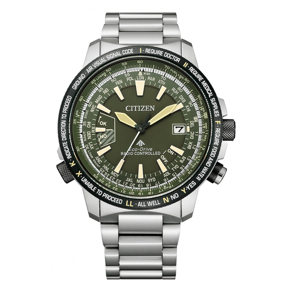 Citizen Promaster Eco-Drive Radio Clock Direct Flight CB0206-86X - men's watch manufactured by Citizen. It has Japanese solar quartz movement and H145 calibre. Titanium, hard coating case of round shape. Case dimensions are 44.3 mm. in diameter and 12 mm. in thickness. The dial of this Citizen watch is green. Display type: analog. This timepiece has sapphire, antireflection coating glass. Titanium, hard coating band, band color: silver. 200 m. water resistance. The watch is from Promaster collection. The following features are equipped: radio controlled, glowing hands, glowing markers, perpetual calendar, antimagnetic, slide rule, world time, date, power reserve indicator.