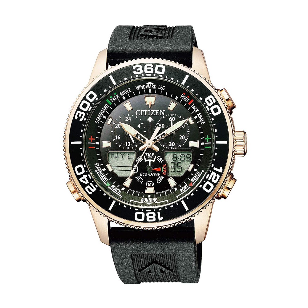 Citizen Promaster JR4063-12E - men's watch manufactured by Citizen. It is equipped with Japanese solar quartz movement and C660 calibre. Stainless steel, gold plated case of round shape. Case dimensions are 44 mm. in diameter and 14.3 mm. in thickness. The dial of this Citizen watch is black, lcd. Display type: analog-digital. This timepiece has mineral glass. Polymer band, band color: black. 200 m. water resistance. The watch is from Promaster collection. The following features are equipped: glowing hands, glowing markers, chronograph, countdown timer, world time, alarm.
