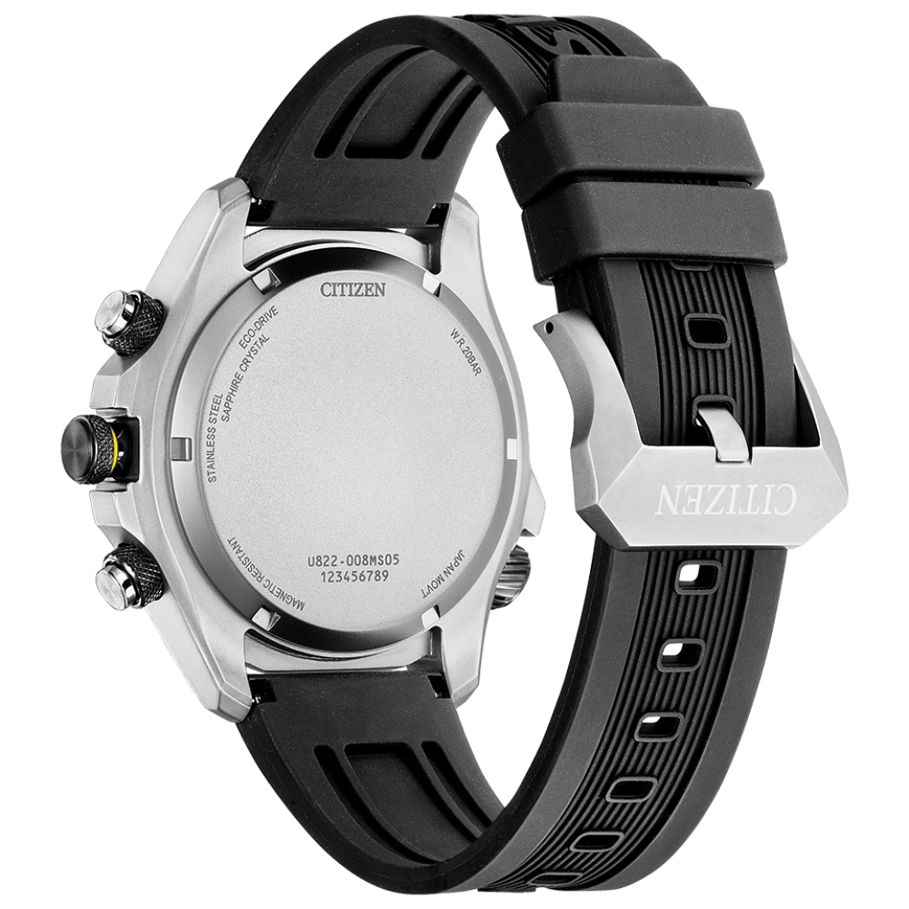 Citizen Promaster Land JV1007-07E - men's watch produced by Citizen. It is equipped with Japanese solar quartz movement and U822 calibre. Stainless steel, hard coating case of round shape. Case dimensions are 43.9 mm. in diameter and 14 mm. in thickness. The dial of this Citizen watch is black. Display type: analog-digital. This timepiece has sapphire, antireflection coating glass. Biomass urethane (benebiol™) band, band color: black. 200 m. water resistance. The watch is from Promaster collection. The following features are equipped: antimagnetic, glowing hands, glowing markers, power reserve indicator, perpetual calendar, date, day, backlight, chronograph, world time, alarm, month, countdown timer.