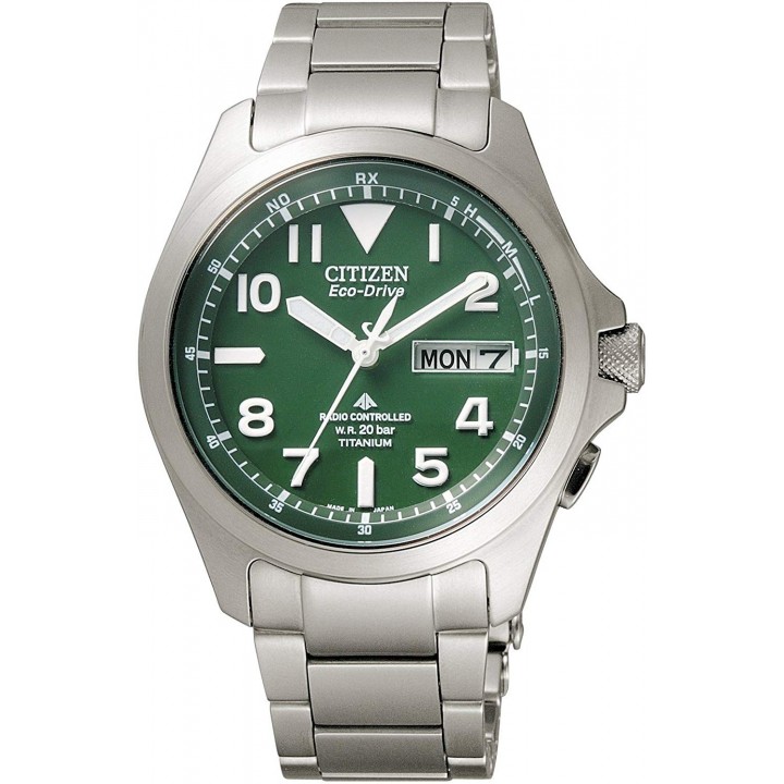 CITIZEN PROMASTER LAND PMD56-2951 - men's watch produced by Citizen. It is equipped with Japanese solar quartz movement and H100 calibre. Titanium, hard coating case of round shape. Case dimensions are 39 mm. in diameter and 11.4 mm. in thickness. The dial of this Citizen watch is green. Display type: analog. This timepiece has sapphire, antireflection coating glass. Titanium band, band color: silver. 200 m. water resistance. The watch is from Promaster collection. The following features are equipped: date, day, perpetual calendar, radio controlled, antimagnetic.