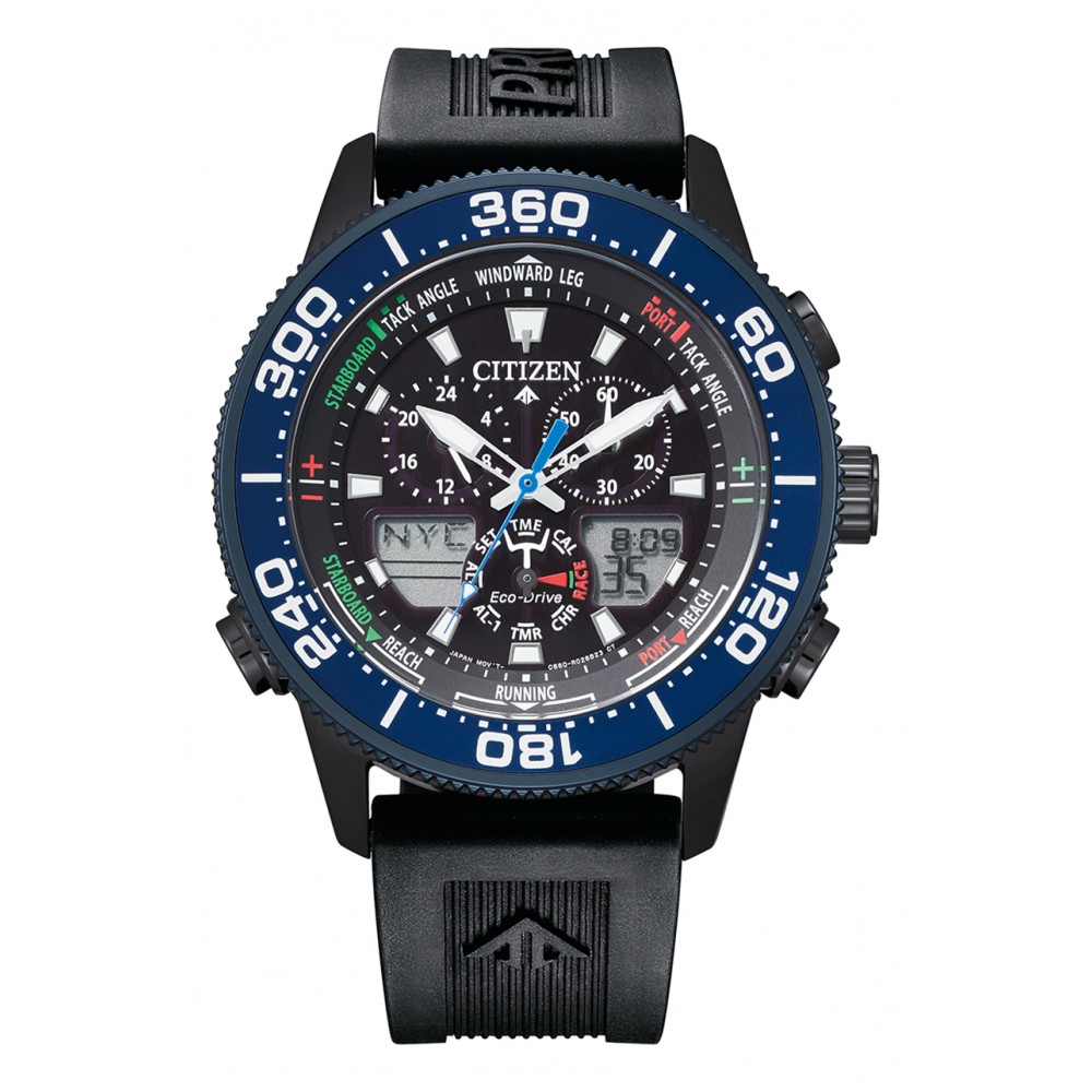 Citizen Promaster Limited Model JR4065-09E - men's watch manufactured by Citizen. It has Japanese solar quartz movement and C660 calibre. Stainless steel, hard coating case of round shape. Case dimensions are 44 mm. in diameter and 14.3 mm. in thickness. The dial of this Citizen watch is black, lcd. Display type: analog-digital. This timepiece has mineral glass. Polymer band, band color: black. 200 m. water resistance. The watch is from Promaster collection. The following features are equipped: glowing hands, glowing markers, chronograph, countdown timer, world time, alarm, date, day, perpetual calendar, month.