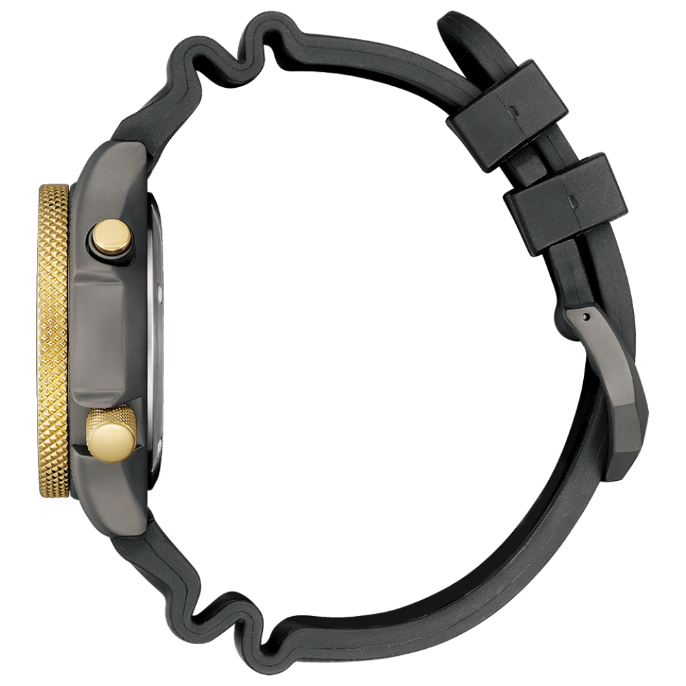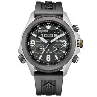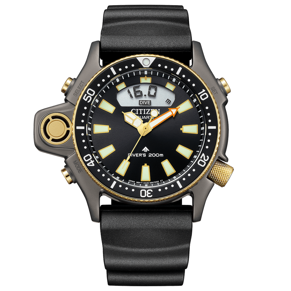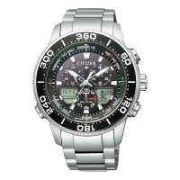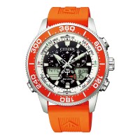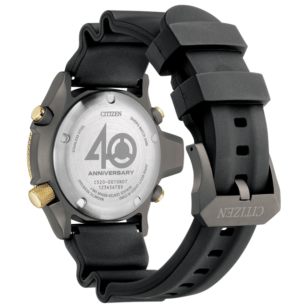 Citizen Promaster Marine Aqualand 40th Anniversary Limited Edition JP2008-06E - men's watch made by Citizen. It is equipped with Japanese quartz movement and C520 calibre. Stainless steel, hard coating case of round shape. Case dimensions are 50.7 mm. in diameter and 14.8 mm. in thickness. The dial of this Citizen watch is black, lcd. Display type: analog-digital. This timepiece has mineral glass. Biomass urethane (benebiol™) band, band color: black. 200 m. water resistance. The watch is from Promaster collection. The following features are equipped: antimagnetic, screw-down crown, glowing hands, glowing markers, perpetual calendar, chronograph, alarm, depth measurement, limited edition, date, day.