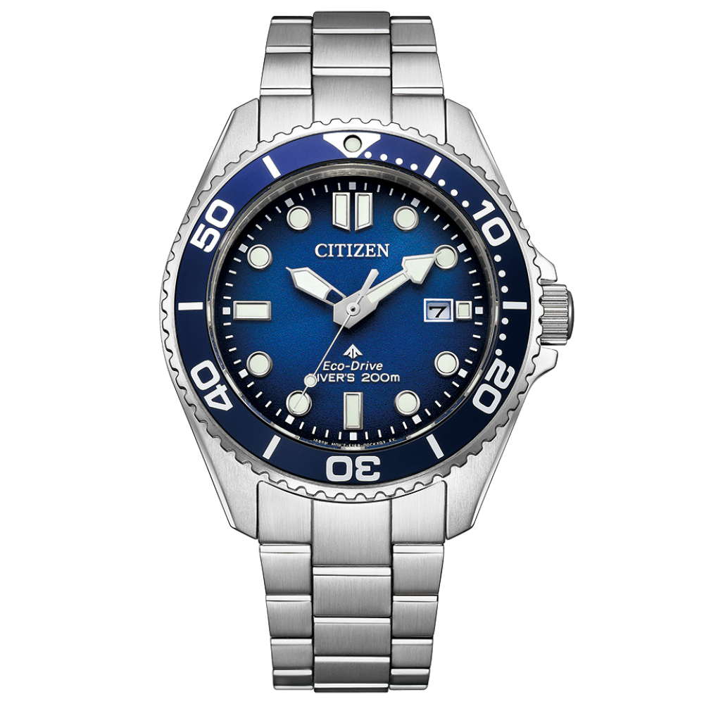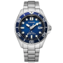 Citizen Promaster Marine BN0260-54L - men's watch made by Citizen. It has Japanese solar quartz movement and E168 calibre. Stainless steel case of round shape. Case dimensions are 40.6 mm. in diameter and 11.7 mm. in thickness. The dial of this Citizen watch is blue. Display type: analog. This timepiece has sapphire, antireflection coating glass. Stainless steel band, band color: silver. 200 m. water resistance. The watch is from Promaster collection. The following features are equipped: antimagnetic, screw-down crown, glowing hands, glowing markers, date.